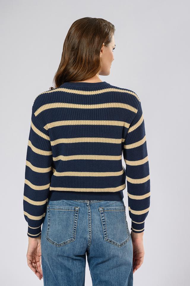 Этот стильный джемпер от i Blues выполнен в классическом дизайне с полосатым узором. Преобладающий цвет – navy, который отлично сочетается с бежевыми полосами, создавая элегантный и универсальный образ.