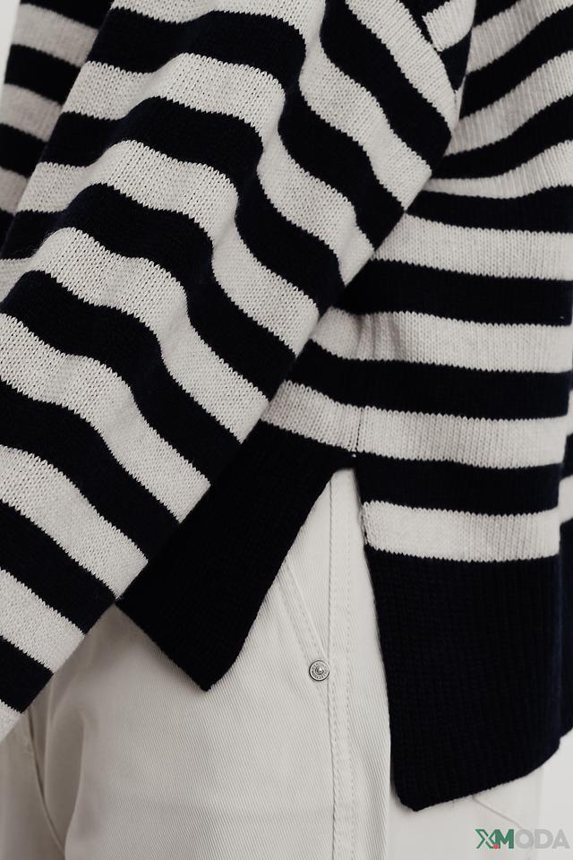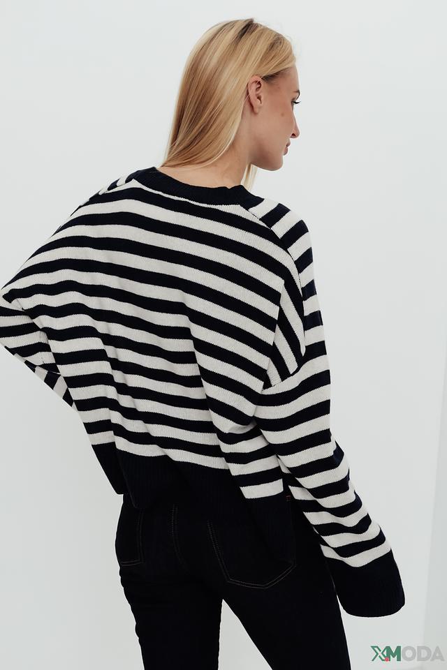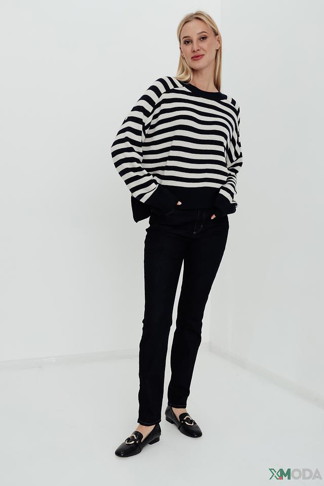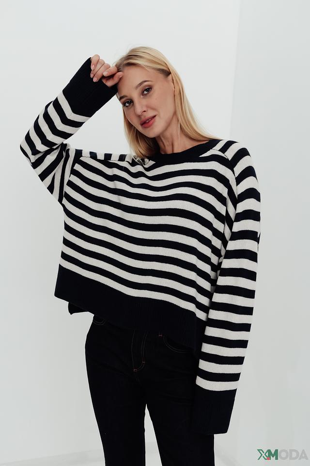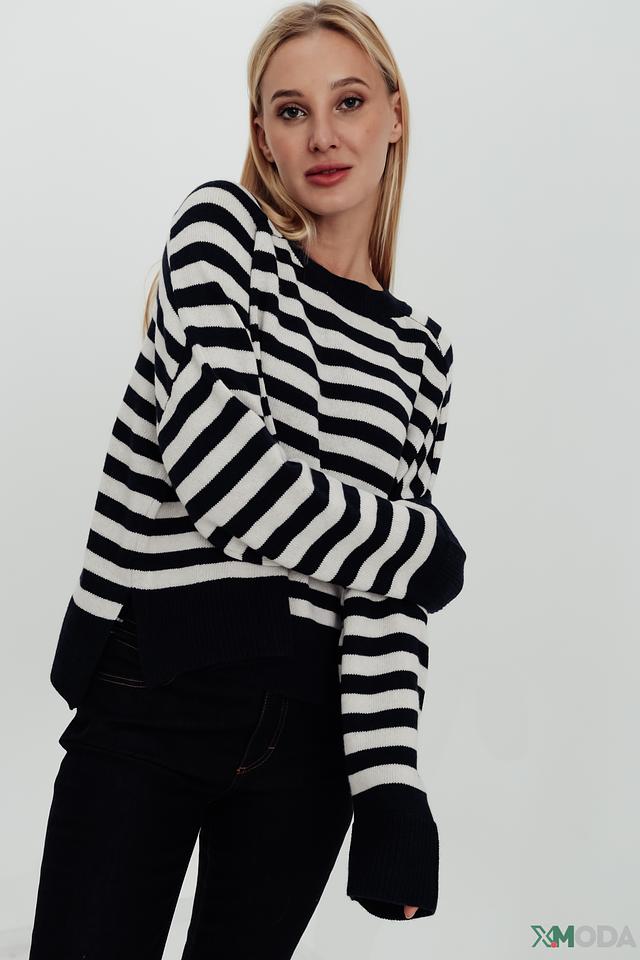 Женский джемпер i Blues чёрно-белого цвета с полосатым узором и рукавами-реглан. Модель выполнена из мягкого и приятного к телу сочетания вискозы, нейлона, шерсти и кашемира. Состав: вискоза 40%, нейлон 30%, шерсть 25%, кашемир 5%