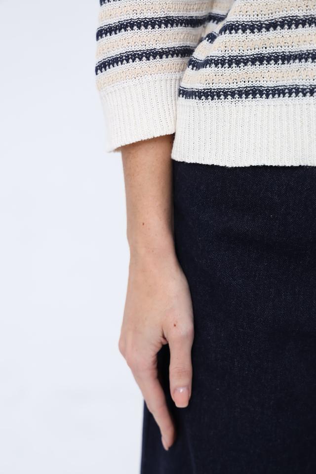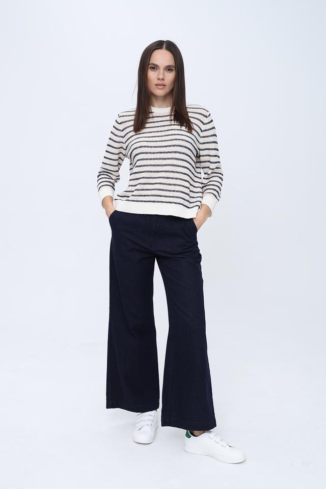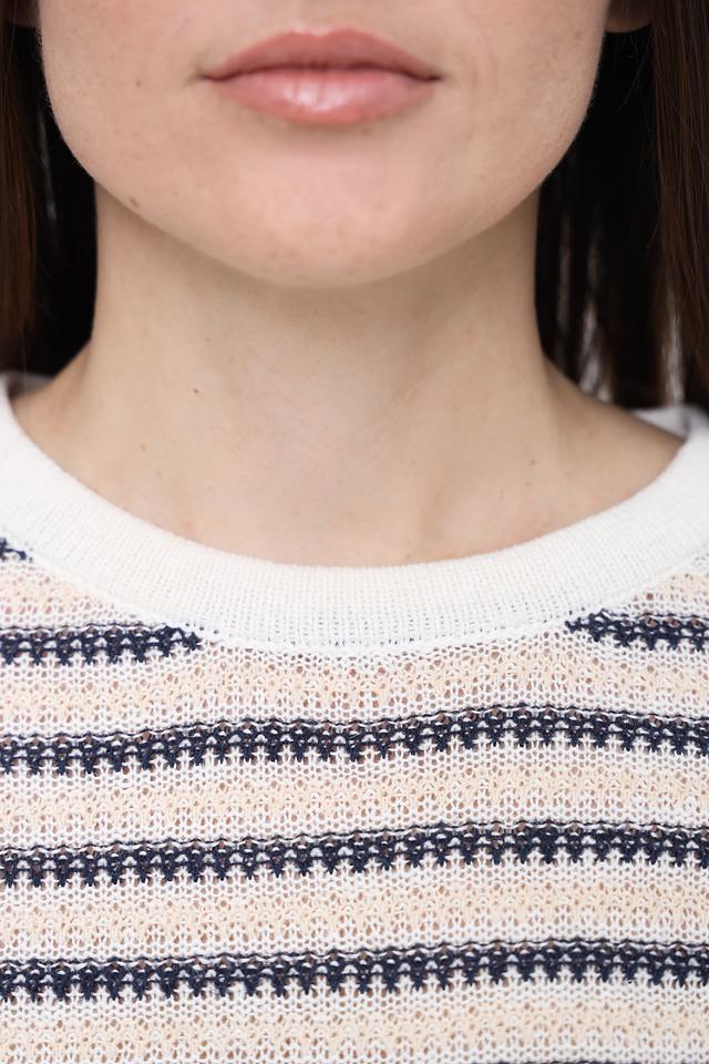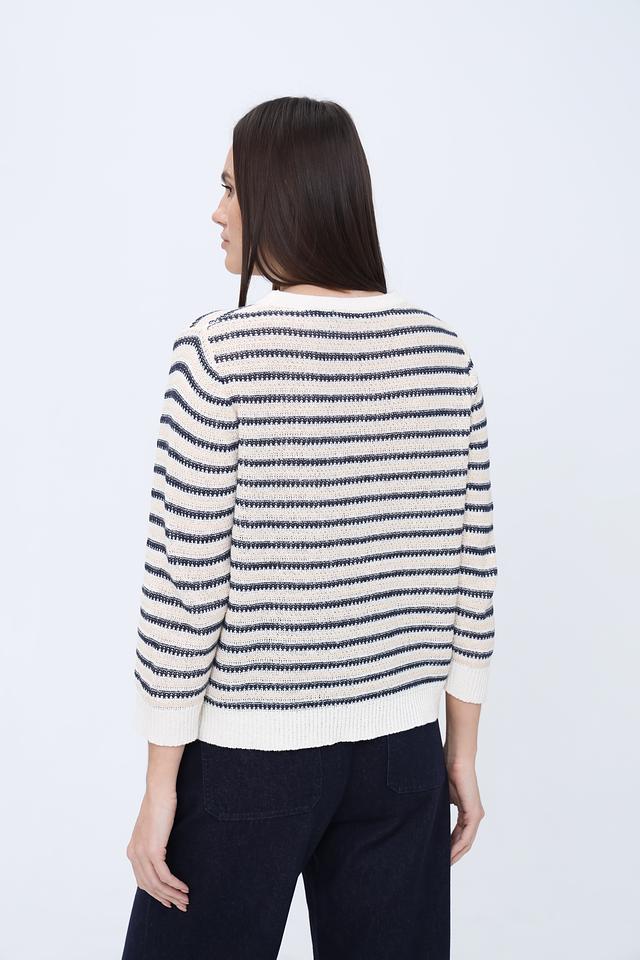 Этот стильный джемпер от Just Valeri выполнен в приятной бежевой расцветке с контрастными темно-синими полосами. Модель имеет круглый вырез горловины и рукава три четверти, что делает ее универсальной для различных образов.
