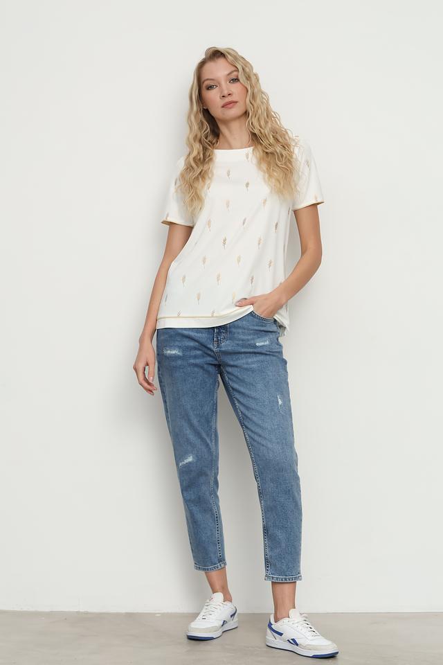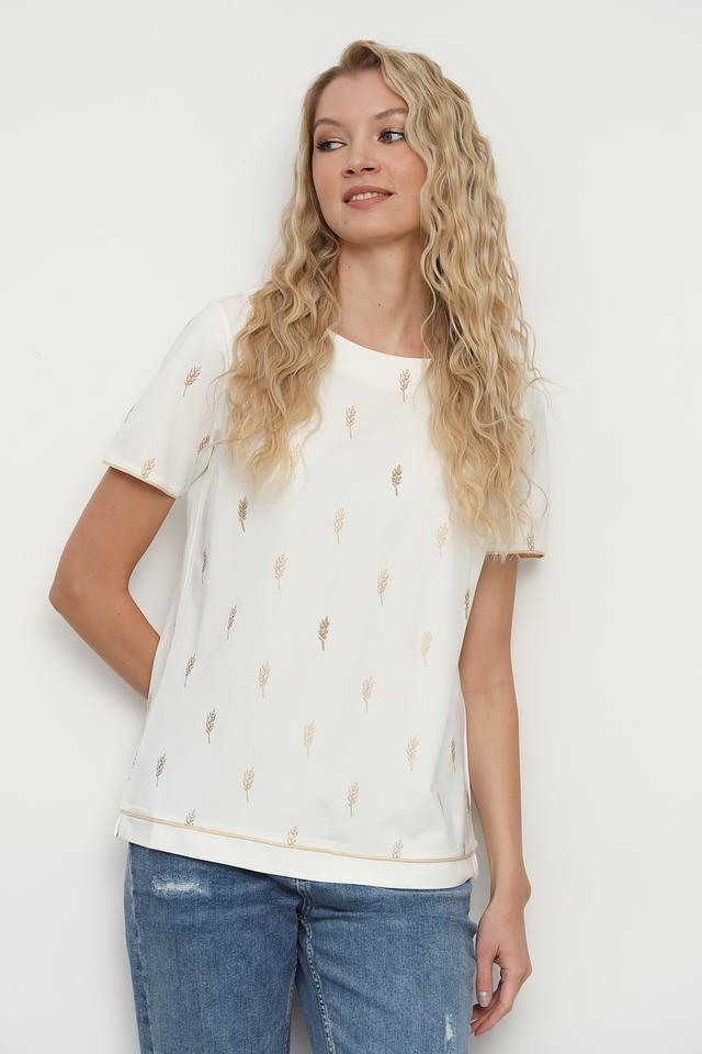 Белый джемпер Leo & Ugo с короткими рукавами, украшенный нежным принтом в виде колосьев. Изготовлен из мягкой вискозы с добавлением полиамида для комфорта и долговечности. Состав: вискоза 63%, полиамид 37%