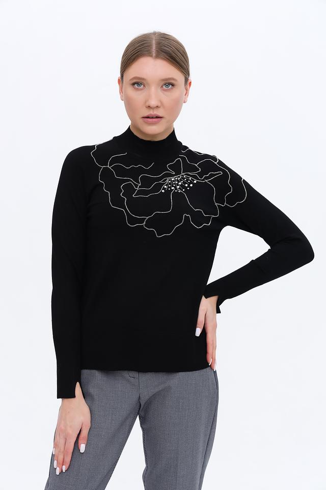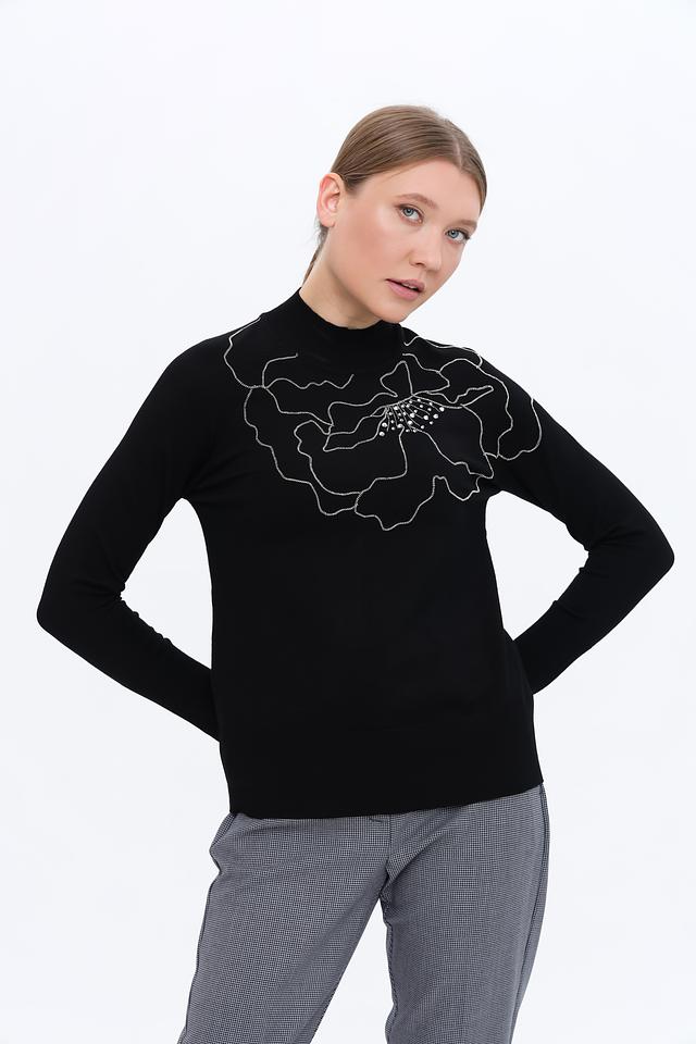 Чёрный джемпер Leo & Ugo с высоким горлом, украшен вышивкой в виде крупного цветка. Модель выполнена из мягкой вискозы с добавлением нейлона, что обеспечивает комфорт и приятные тактильные ощущения. Состав: вискоза 72%, нейлон 28%