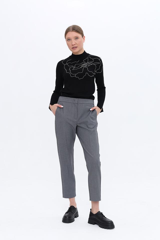 Особенностью модели является декоративная вышивка в виде крупного цветка, выполненная серебристыми нитями. Высокий горл придаёт изделию изысканность и защищает от холода. Джемпер имеет прямой крой и длинные рукава.
