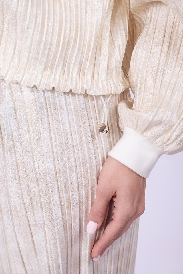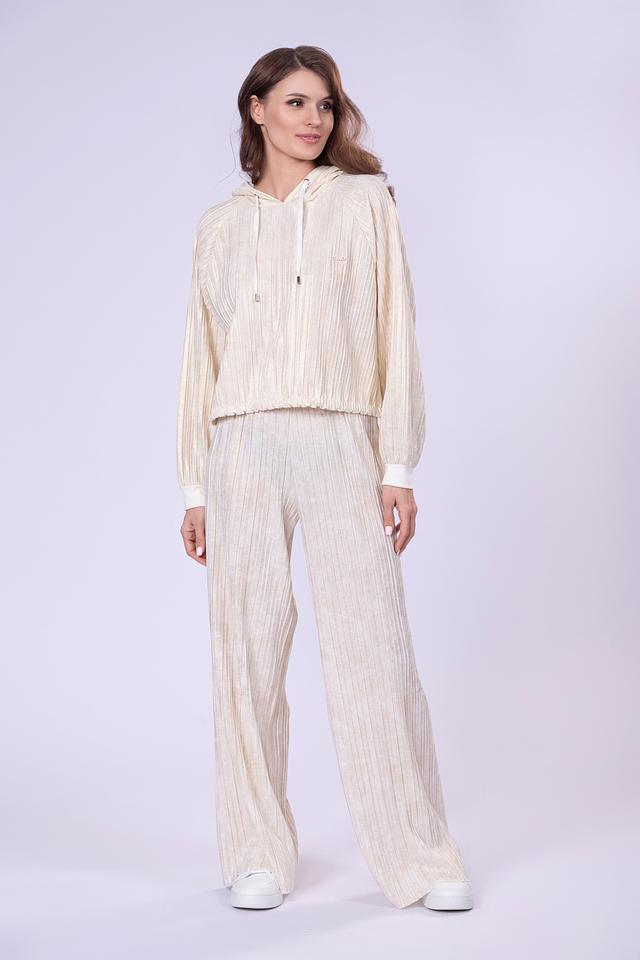 Джемпер имеет бежевый цвет и текстурированную поверхность, создающую интересный визуальный эффект. Капюшон с кулисками позволяет регулировать силуэт, а длинные рукава с манжетами обеспечивают дополнительное тепло.