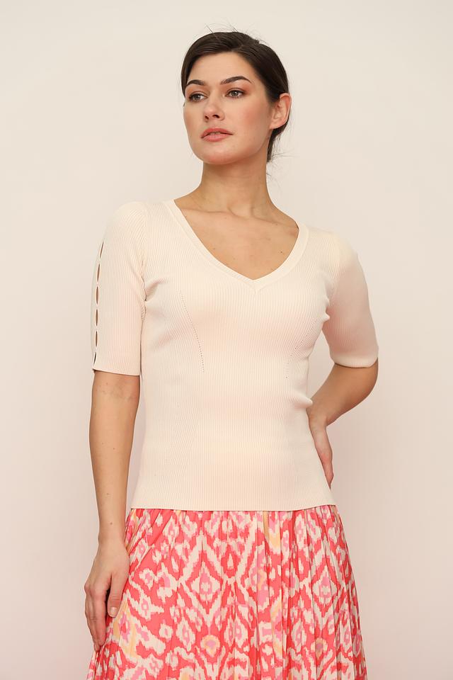 Бежевый джемпер от Marciano с V-образным вырезом и декоративными разрезами на рукавах. Изготовлен из мягкой вискозы и полиамида, обеспечивающих комфорт и приятные ощущения при носке. Состав: вискоза 78%, полиамид 22%