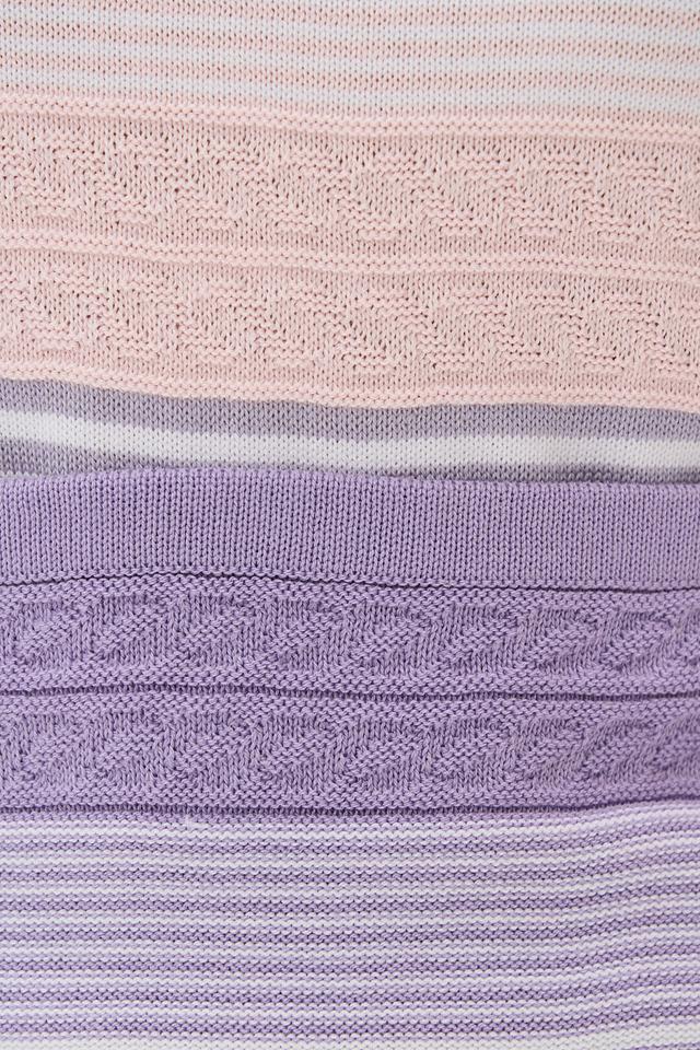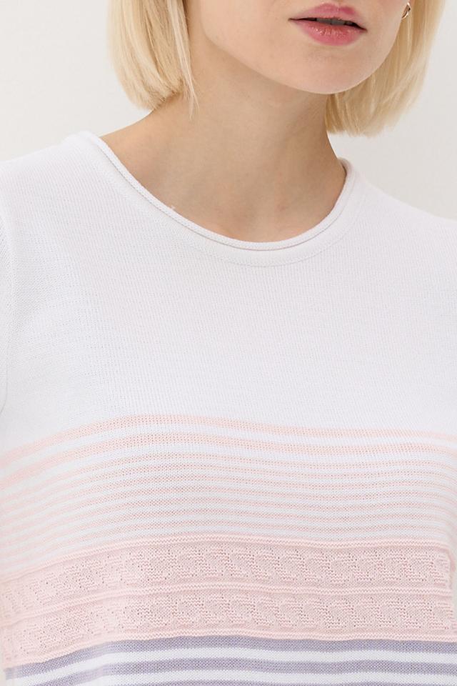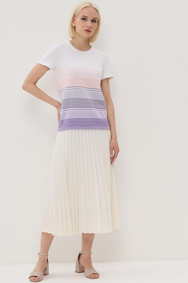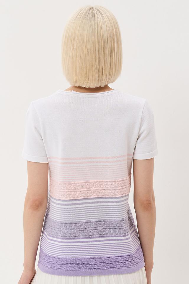 Особенность этой футболки – яркий горизонтальный рисунок в полоску, сочетающий в себе белый, розовый, лавандовый и лиловый цвета. Такой принт добавит вашему образу свежести и оригинальности.
