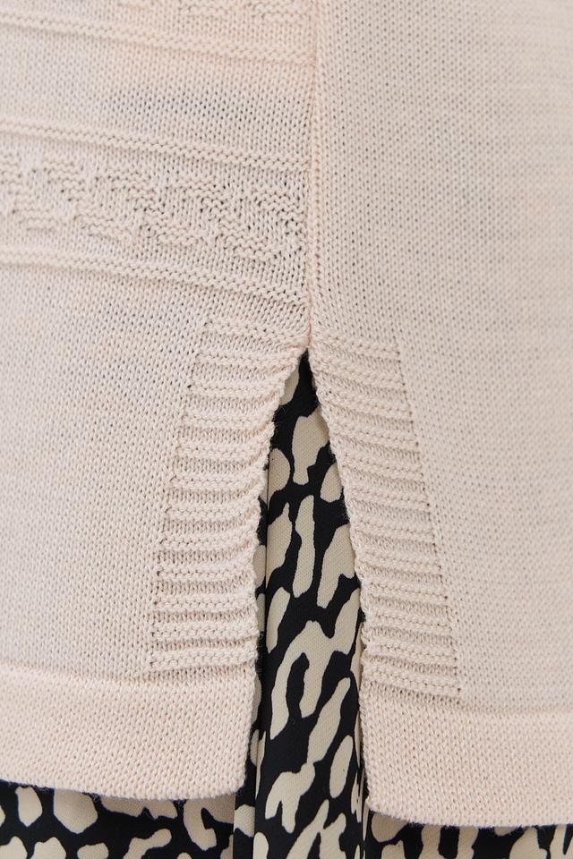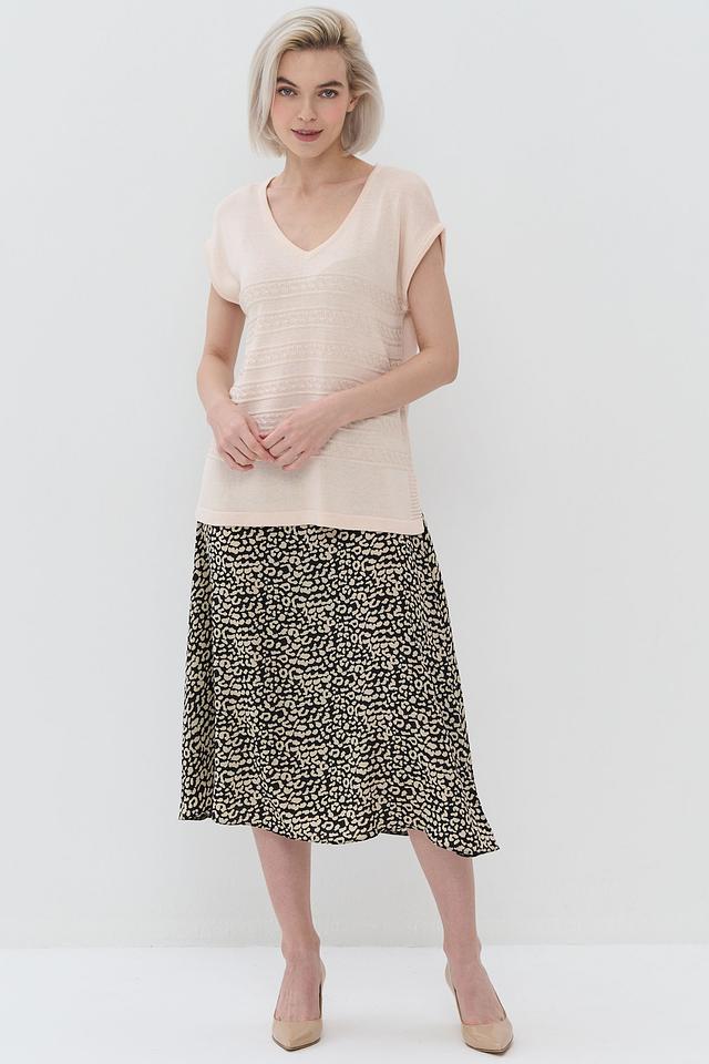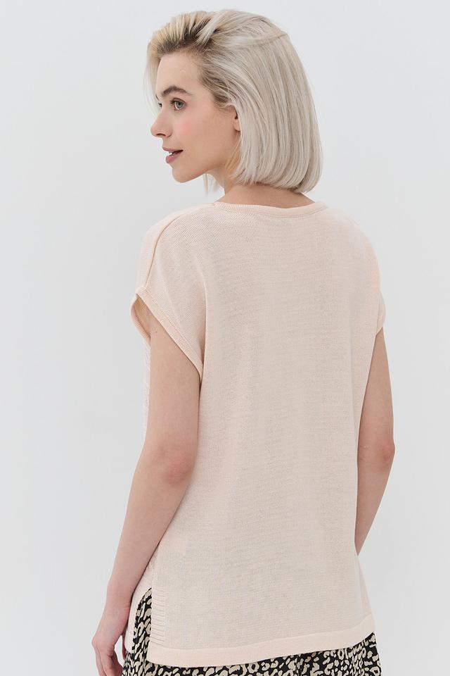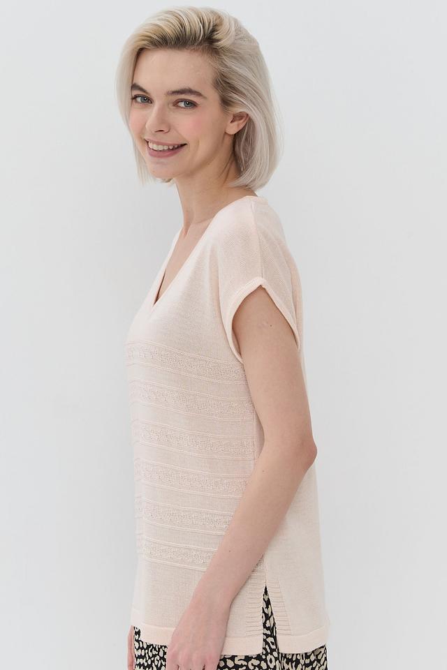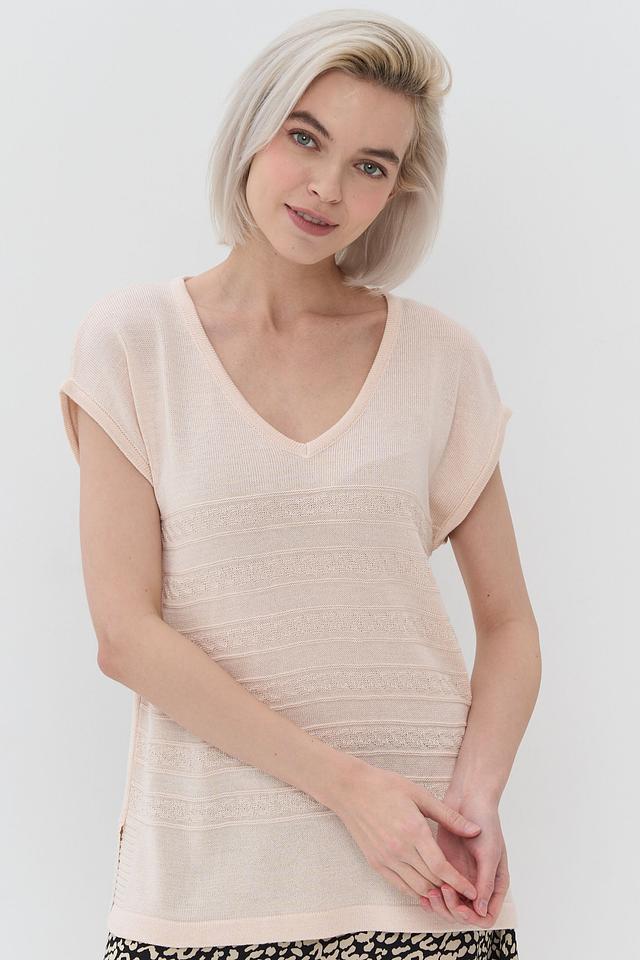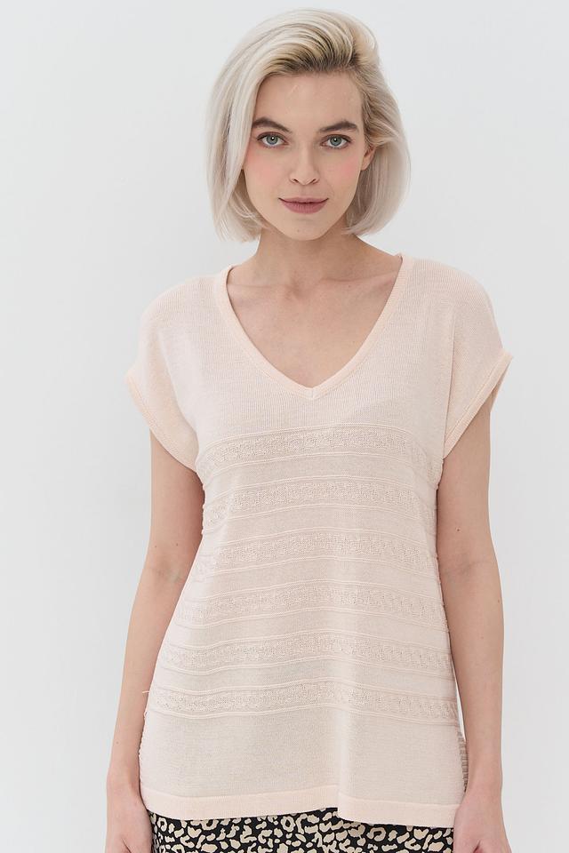 Розовый джемпер NEWVAY с V-образным вырезом и короткими рукавами. Модель выполнена из мягкого трикотажа с текстурной вязкой, что придает ей особый шарм и комфорт в носке. Состав: вискоза 50%, пан 50%