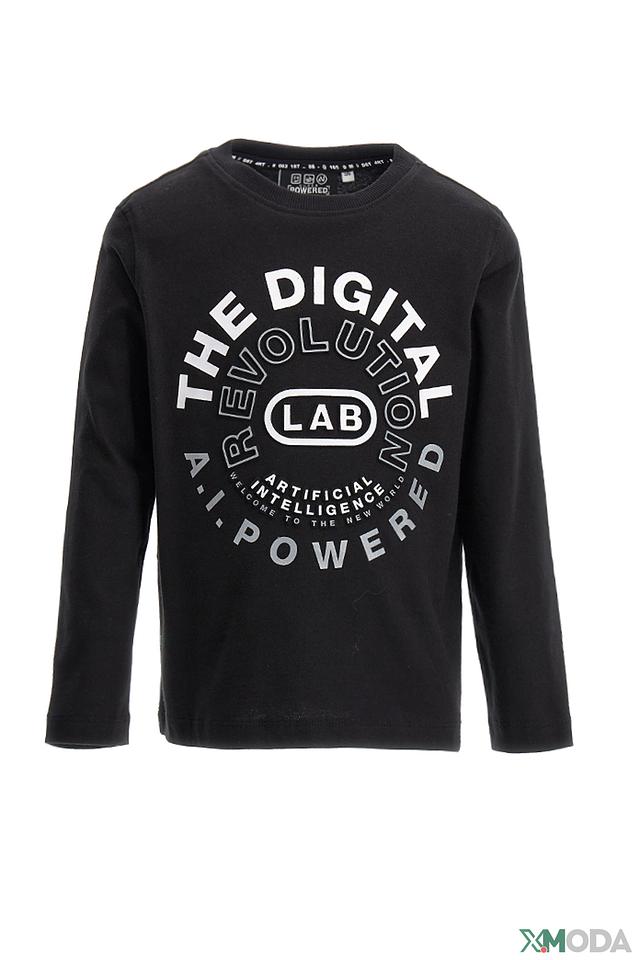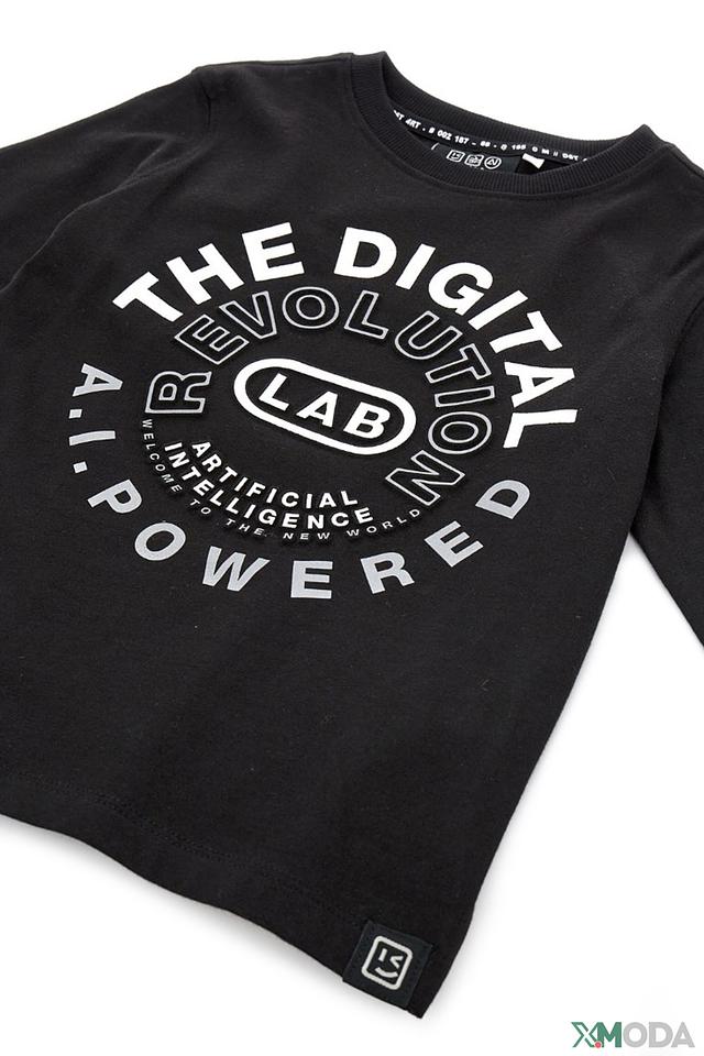 Лонгслив имеет классический крой и длинные рукава, идеально подходящие для прохладной погоды. Главной особенностью модели является яркий и оригинальный принт "The Digital Evolution Lab" с надписями и графическими элементами, выполненный в белом цвете.
