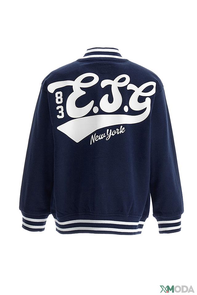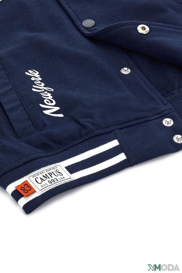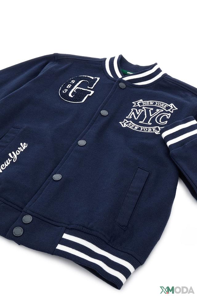 Основной цвет джемпера – насыщенный синий, который хорошо сочетается с белыми полосами на рукавах, воротнике и нижней части изделия. На груди и спине расположены яркие нашивки с логотипом New York и надписями, добавляющие индивидуальности.