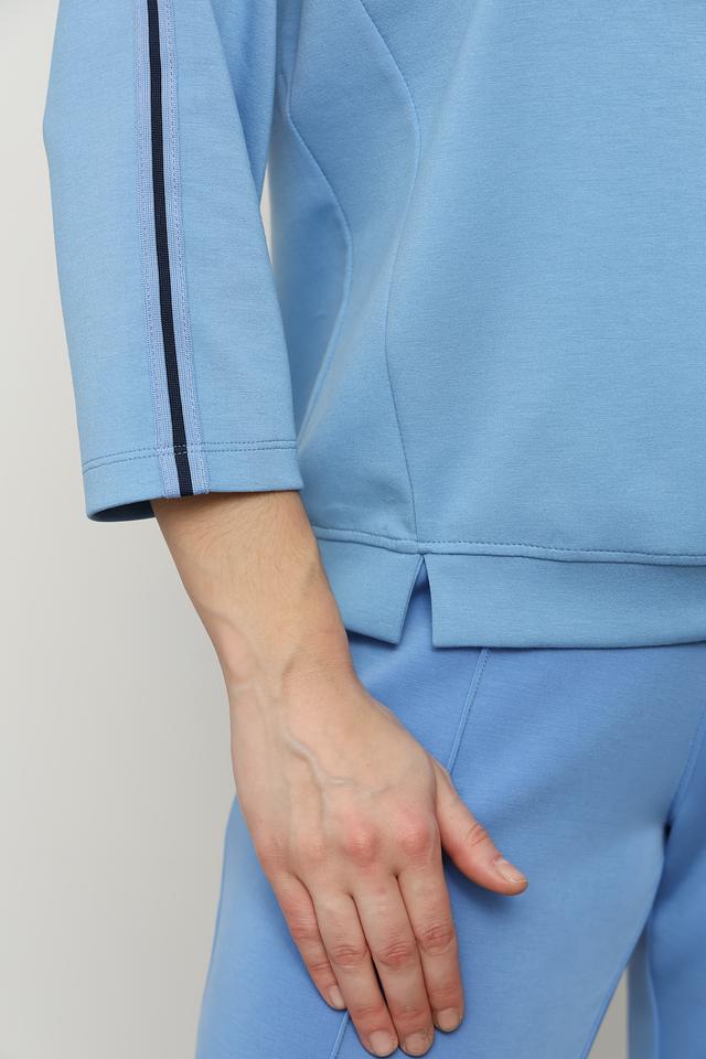 Джемпер имеет удобный, слегка свободный крой, который обеспечивает комфорт при носке. Рукава – три четверти, что делает его идеальным для теплой погоды или для создания многослойных образов. По бокам изделия расположены декоративные полосы в тон шнуркам.