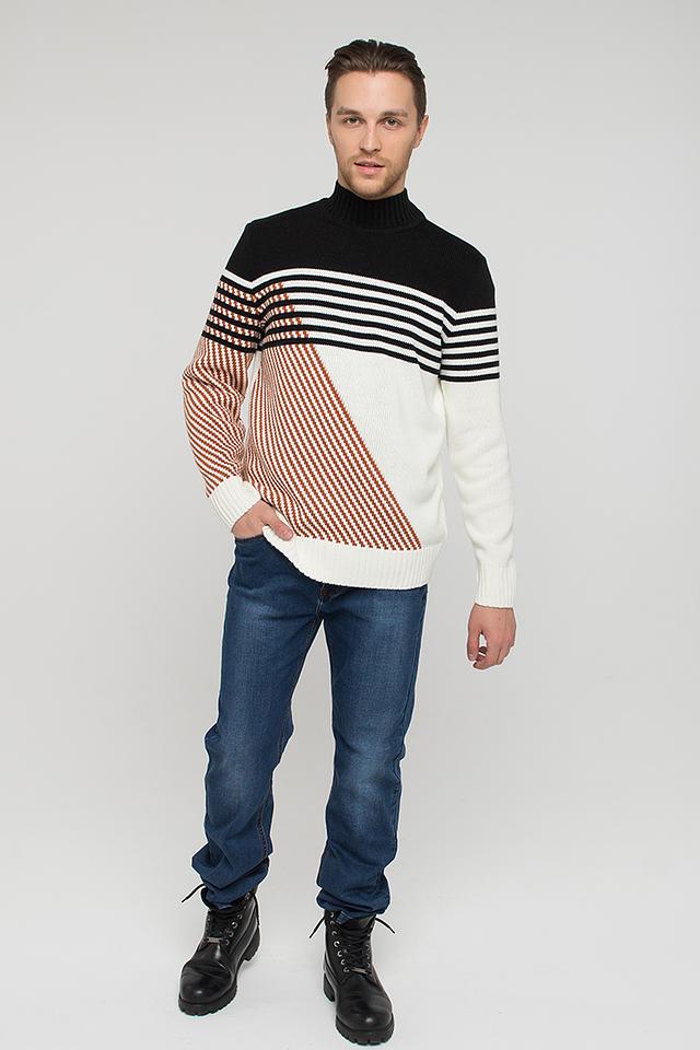Мужской джемпер BE YOU чёрно-белого цвета с геометричным узором. Изготовлен из сочетания пан и шерсти, что обеспечивает комфорт и тепло. Стильный и универсальный выбор для повседневного гардероба. Состав: пан 70%, шерсть 30%