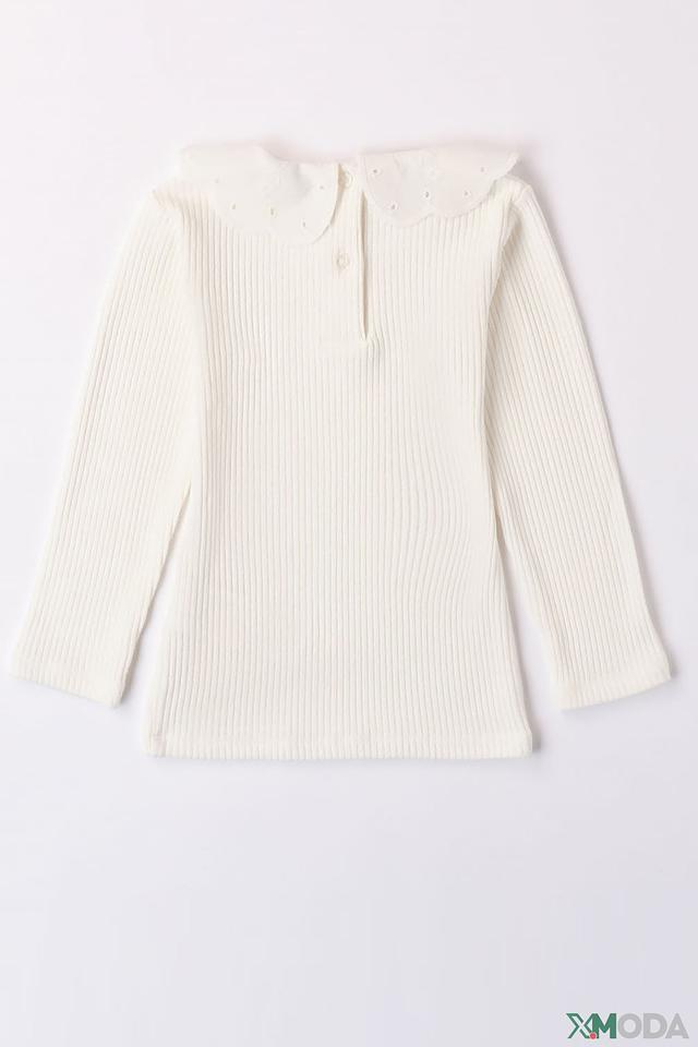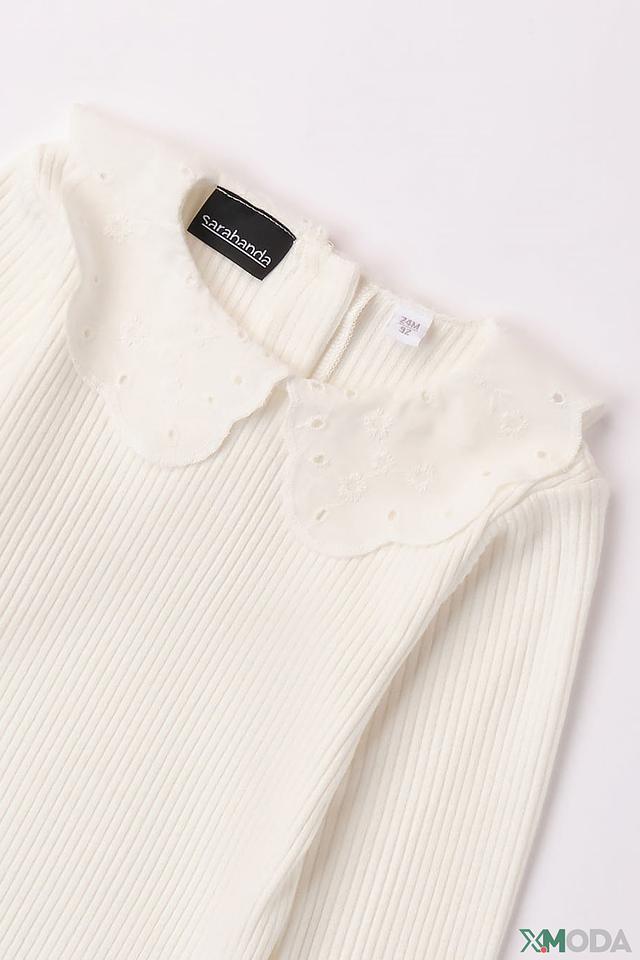 Джемпер имеет классический крой с длинными рукавами и круглым вырезом, который обрамлен аккуратным воротником-стойкой, украшенным нежным кружевом. Текстура изделия выполнена в рубчик, что придает ему дополнительный объем и интересную фактуру.