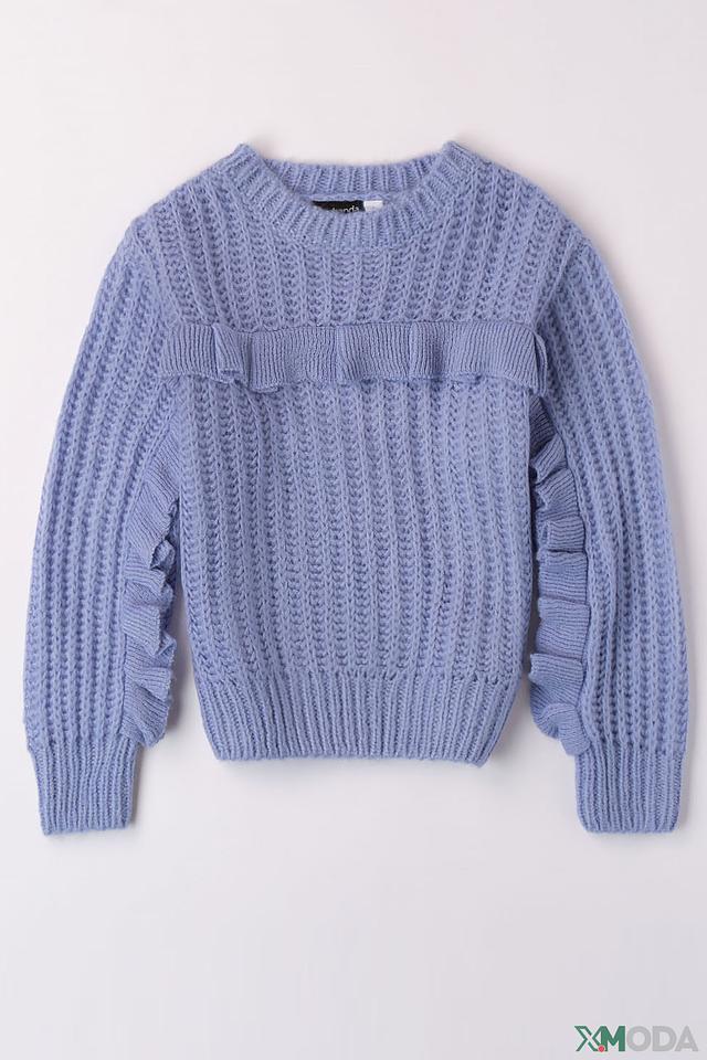 Модель имеет классический крой с округлым вырезом горловины и длинными рукавами. Особый шарм изделию придают декоративные рюши, расположенные на плечах и манжетах рукавов. Голубой цвет джемпера универсален и легко сочетается с другими элементами одежды.