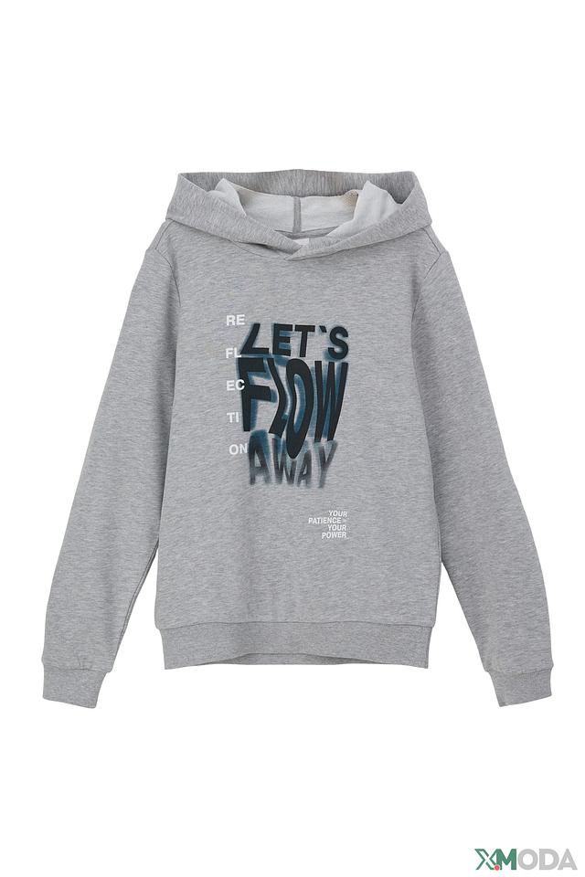 Джемпер имеет классический крой с длинными рукавами и удобным капюшоном. Основной цвет – серый меланж, который легко сочетается с другими элементами одежды. Передняя часть украшена ярким принтом с надписью “LET’S FLOW AWAY” и графическими элементами.