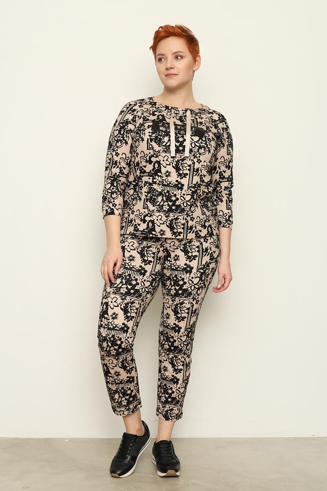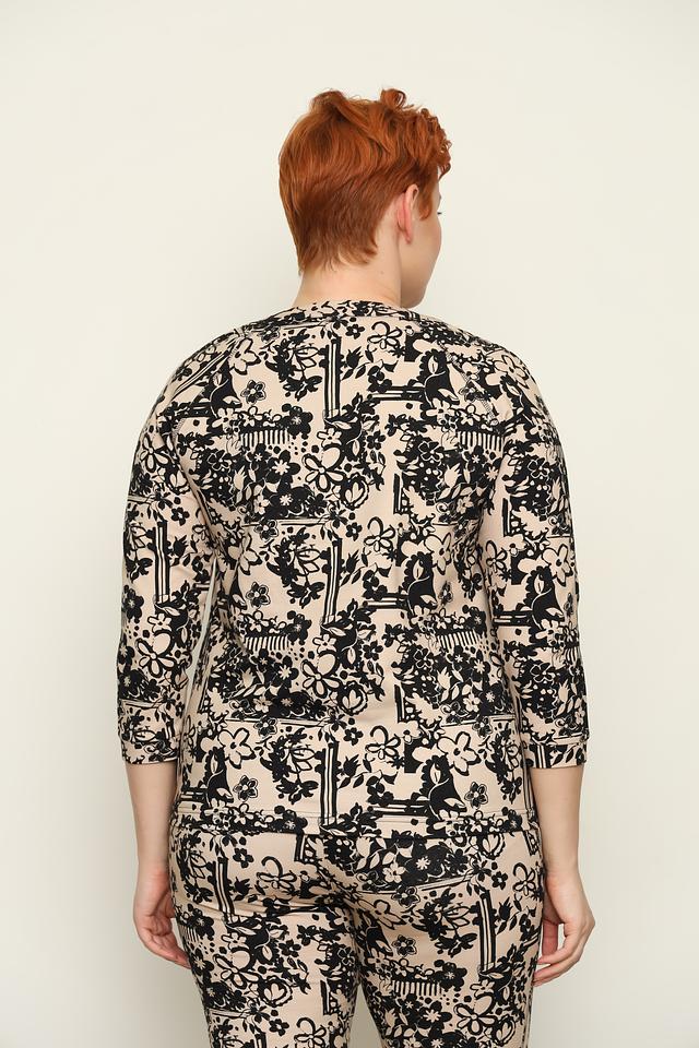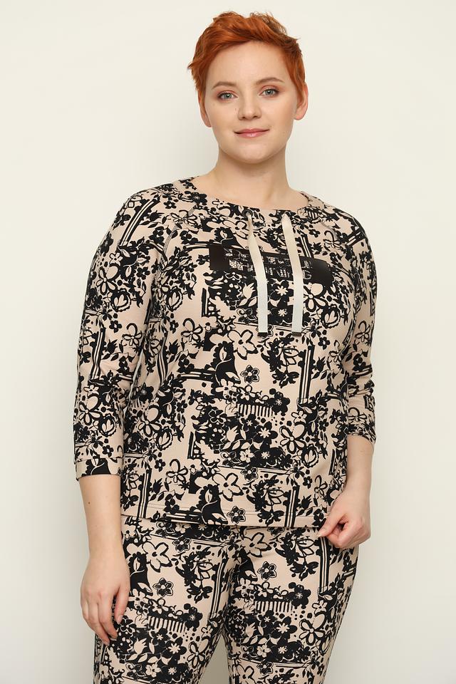 Джемпер имеет бежевый цвет и украшен ярким цветочным принтом в чёрно-белой гамме. Вырез горловины каплевидной формы, декорирован тонкими белыми шнурками, которые добавляют образу легкости и непринужденности.
