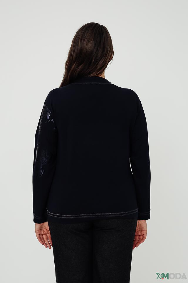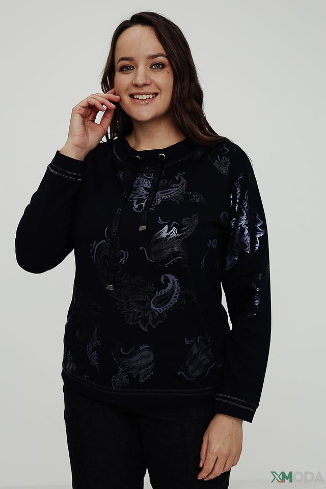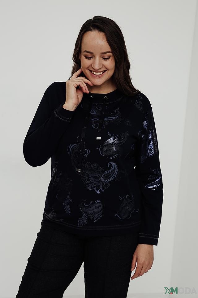 Особенности модели включают круглый вырез горловины и манжеты на рукавах. Принт расположен на передней части джемпера, добавляя ему выразительности.