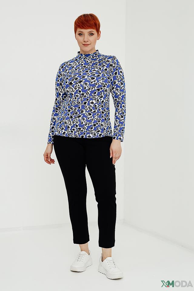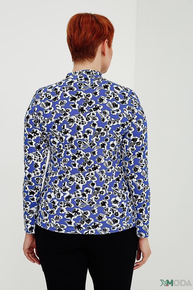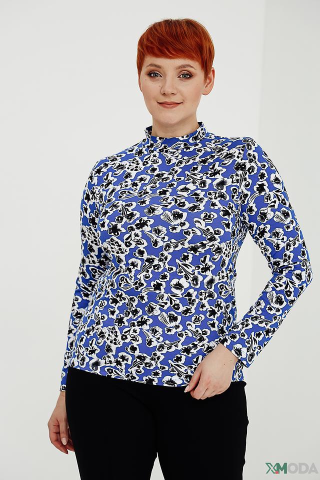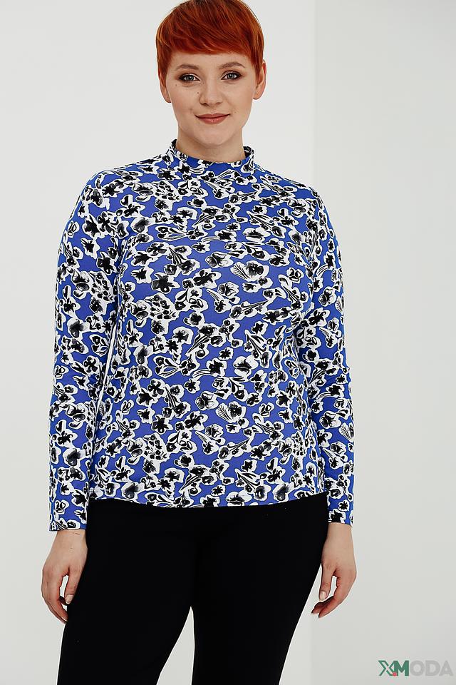 Джемпер имеет прямой крой и удобную длину. Высокий воротник-стойка добавляет элегантности образу. Основной цвет джемпера – насыщенный синий, который служит прекрасным фоном для яркого цветочного принта.