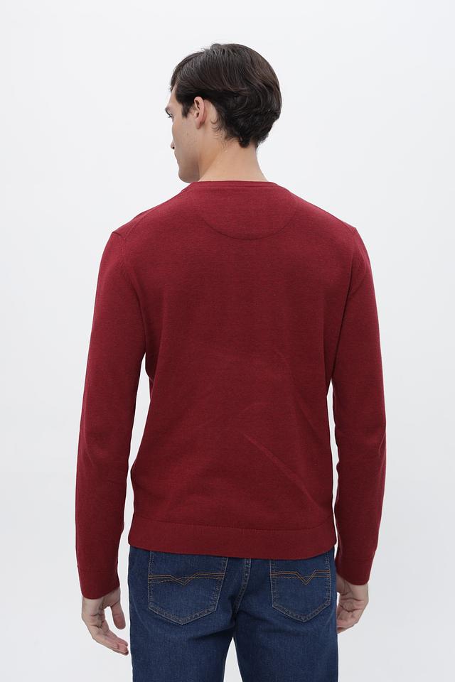 Модель имеет классический крой с круглым вырезом горловины и длинными рукавами. Преобладающий бордовый цвет придает изделию элегантный и сдержанный вид.