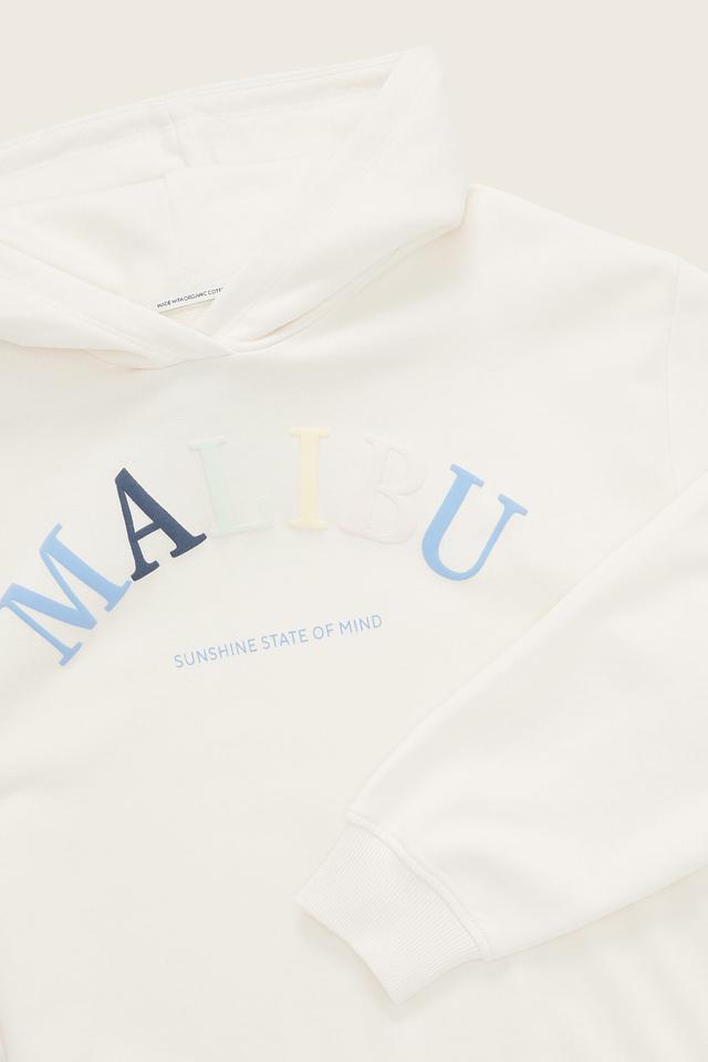 Основным акцентом худи является яркая надпись "MALIBU", выполненная в разноцветном дизайне – буквы выполнены в синем, красном, жёлтом и голубом цветах. Под надписью размещена надпись "SUNSHINE STATE OF MIND", добавляющая образу игривости и позитива.