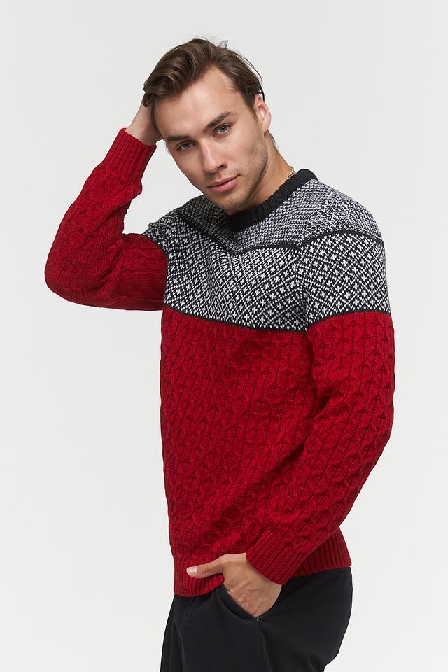 Мужской джемпер VAY красного цвета с оригинальным жаккардовым узором. Изготовлен из сочетания шерсти и пана, обеспечивающего комфорт и тепло. Идеально подходит для создания стильного повседневного образа. Состав: пан 70%, шерсть 30%