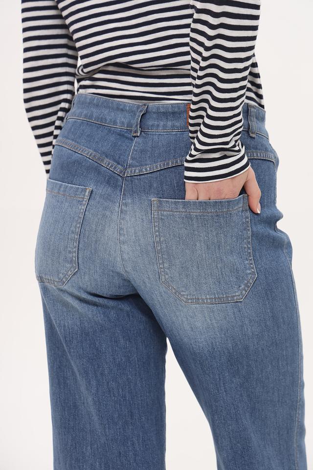 Джинсы имеют клешеный крой, который визуально удлиняет ноги и создает женственный силуэт. Высокая посадка подчеркивает талию и обеспечивает комфортную посадку. Пять карманов — два спереди и два сзади — добавляют функциональности.