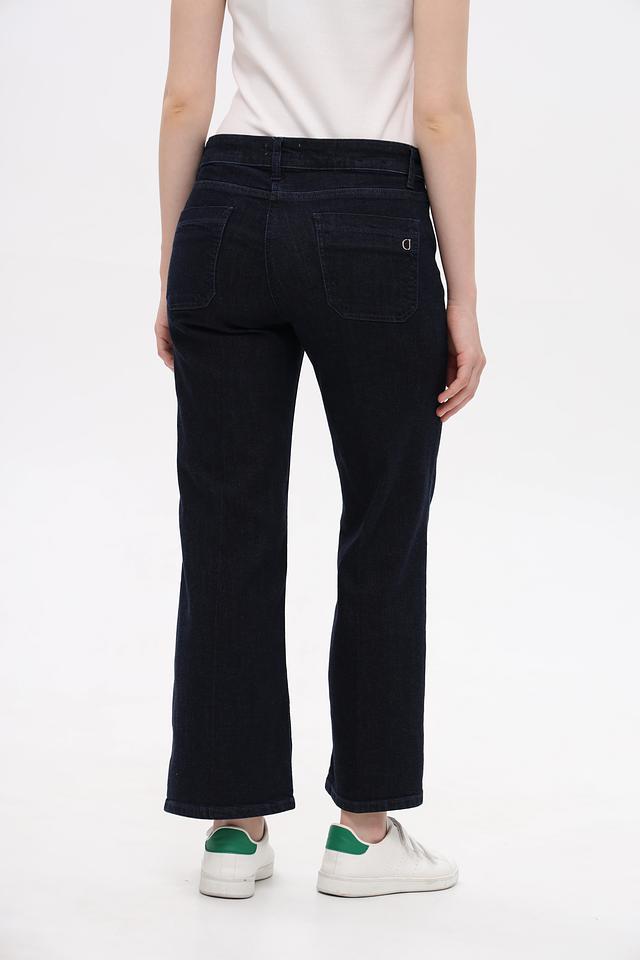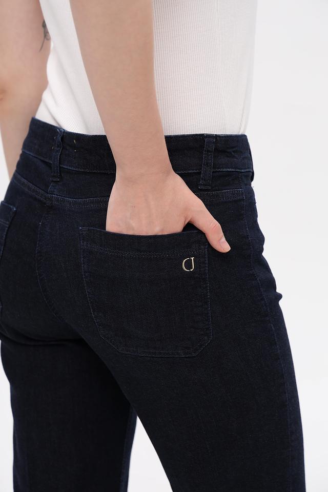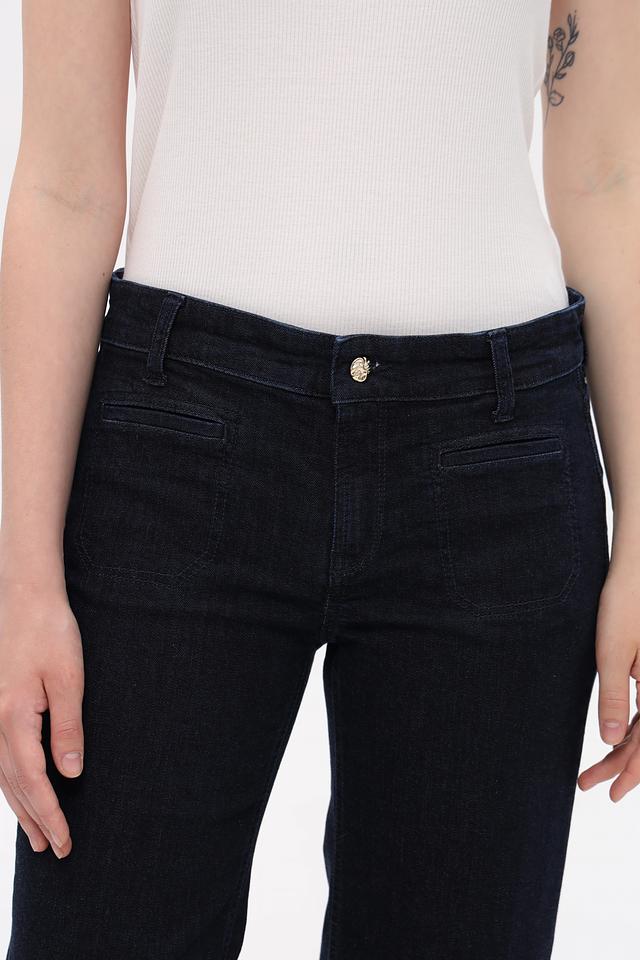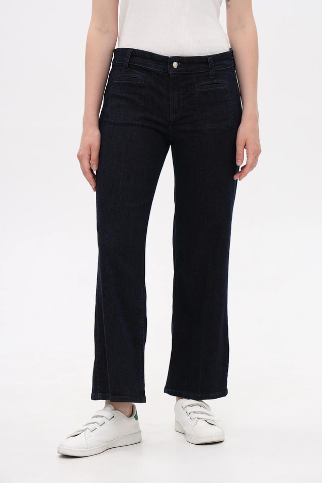 Женские джинсы Cambio классического кроя, выполнены из плотного денима насыщенного темно-синего цвета. Модель характеризуется высокой посадкой, подчеркивающей талию, и силуэтом клеш, визуально удлиняющим ноги.