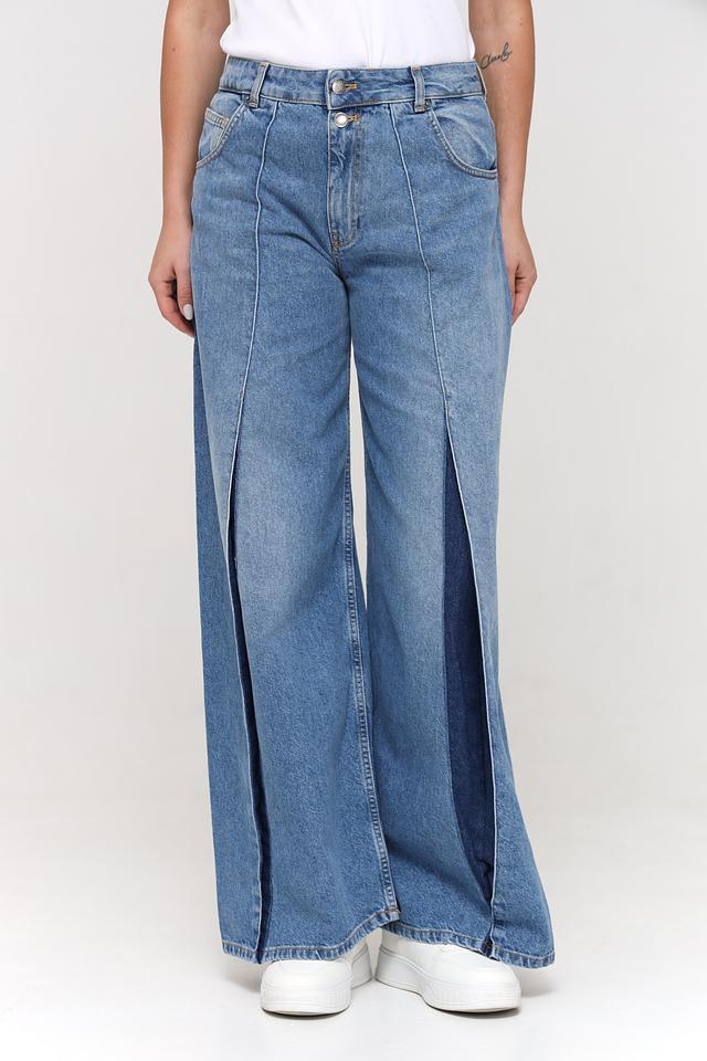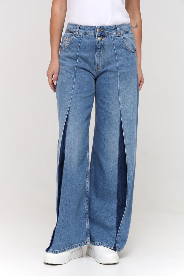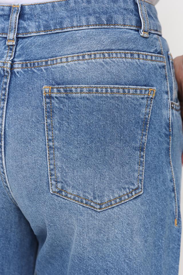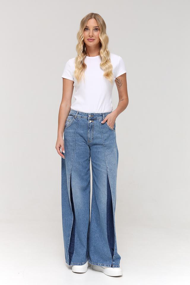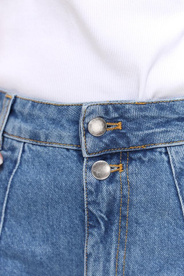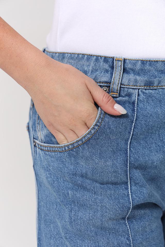 Джинсы имеют классическую посадку на талии и застежку на пуговицы. Передняя часть джинсов украшена вертикальными вытачками, которые визуально удлиняют ноги и придают образу изысканность. Задние карманы выполнены в традиционном стиле.