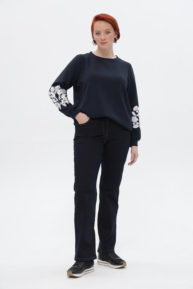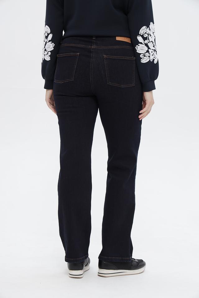 Джинсы имеют высокую посадку и классический клёш, что визуально удлиняет ноги и создает элегантный силуэт. На задних карманах присутствует декоративная строчка, подчеркивающая стиль и индивидуальность изделия. Тёмно-синий цвет делает эти джинсы универсальным элементом гардероба, который легко сочетается с различными видами верха.