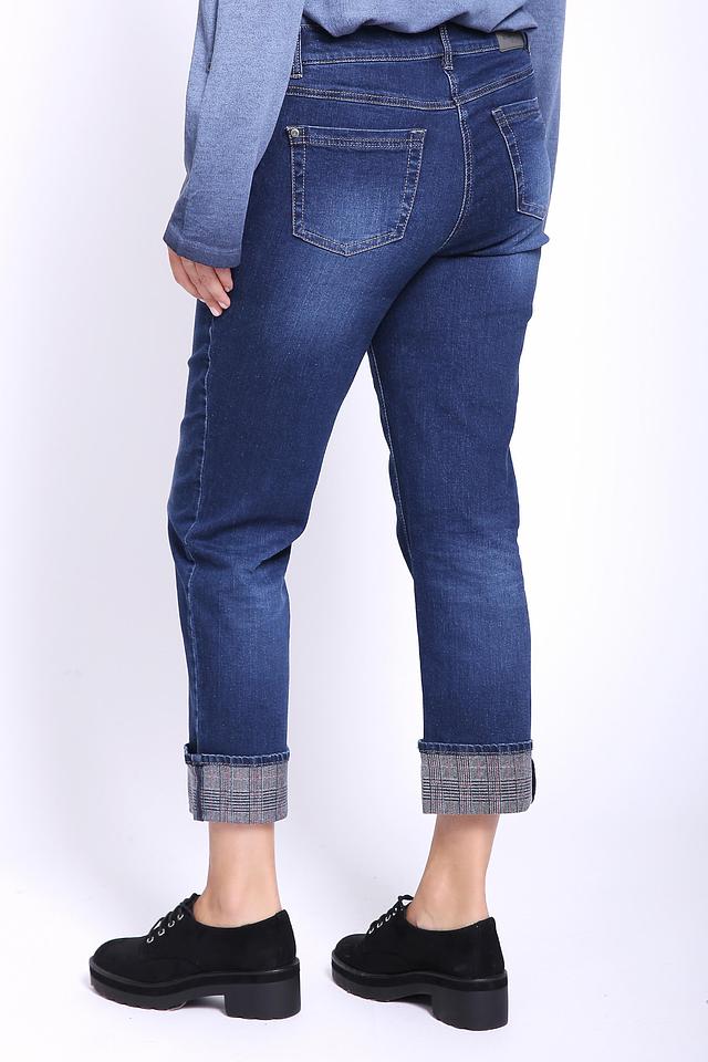 Особенностью этих джинсов является декор в клетку на манжетах, который добавляет оригинальности образу. Прямой крой обеспечивает комфортную посадку по фигуре, а эластан в составе добавляет эластичности и свободы движений.