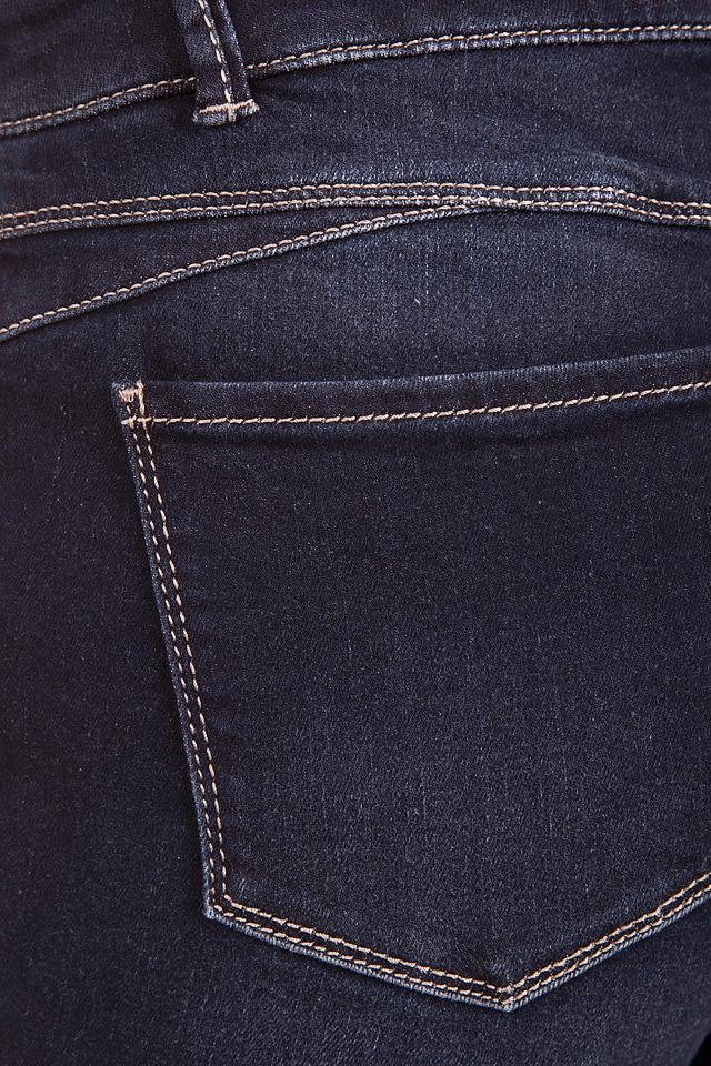 Особенностью этих джинсов является контрастная белая строчка, которая подчеркивает линии кроя и добавляет образу оригинальности. Задние карманы также оформлены контрастной строчкой и имеют декоративные элементы.