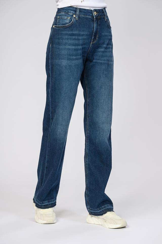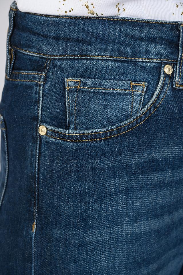 Джинсы выполнены из высококачественного хлопка с добавлением эластана, что обеспечивает комфорт при носке и сохранение формы. Плотный деним приятен к телу и хорошо держит форму. Застежка на молнию и пуговицу, а также пять карманов – два спереди, два сзади и один небольшой карман для мелочи.