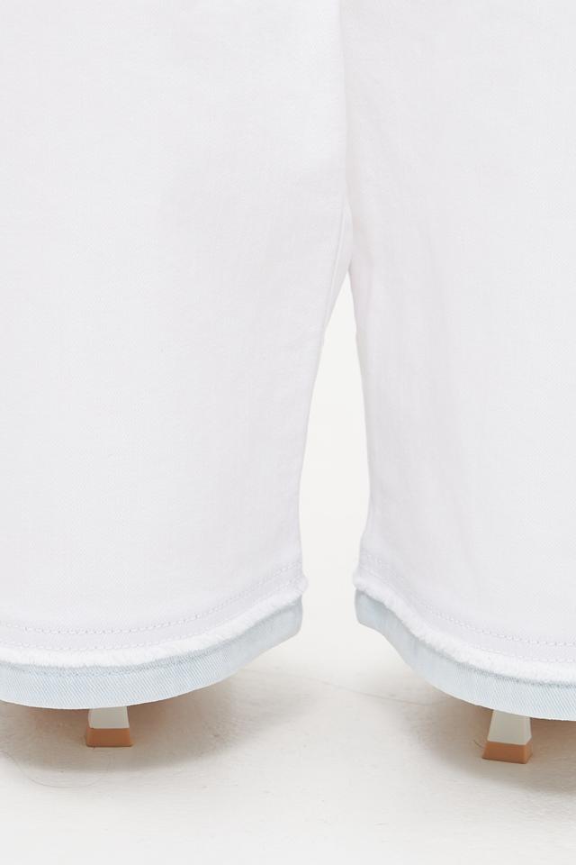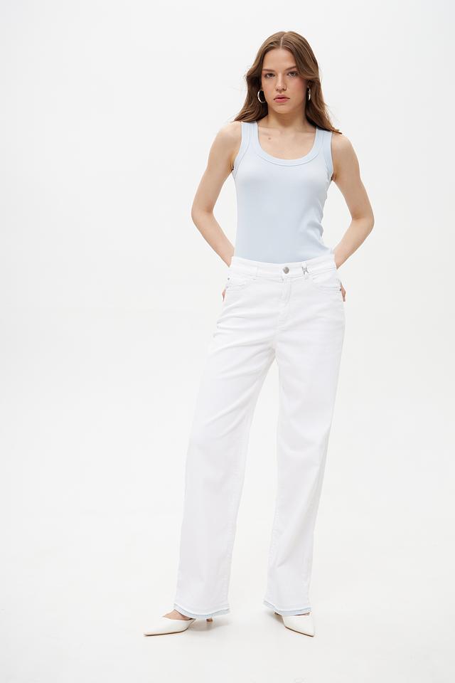 Широкие ноги создают расслабленный силуэт, а слегка укороченная длина делает модель актуальной и стильной. Джинсы идеально подойдут для создания повседневных образов в сочетании с топами, футболками и другой одеждой. Низ брюк выполнен с голубой окантовкой.