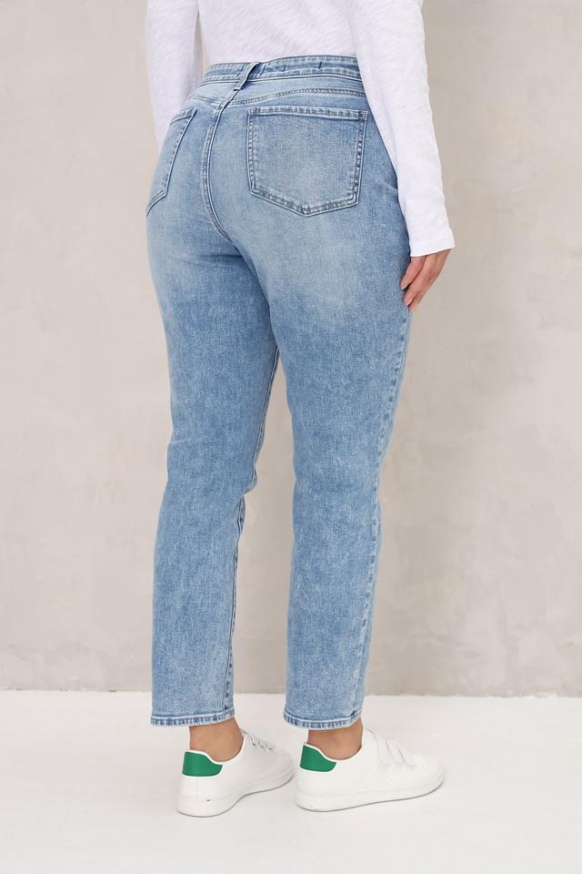 Джинсы имеют зауженный к низу силуэт, который визуально удлиняет ноги и создает современный образ. Высокая посадка подчеркивает талию и обеспечивает комфортную посадку. Ткань состоит из 99% хлопка и 1% эластана, что обеспечивает мягкость, воздухопроницаемость и небольшую эластичность.