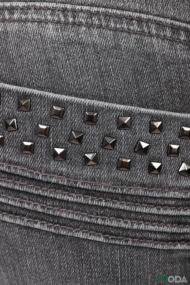 Джинсы имеют классический прямой крой и серый цвет с эффектом потертости, что придает им стильный и современный вид. Оригинальной деталью является декоративная отделка в виде металлических заклепок на задних карманах, которая добавляет образу дерзости и индивидуальности.