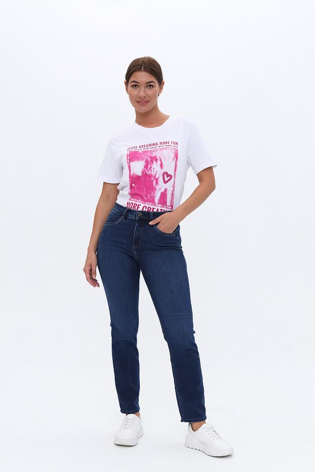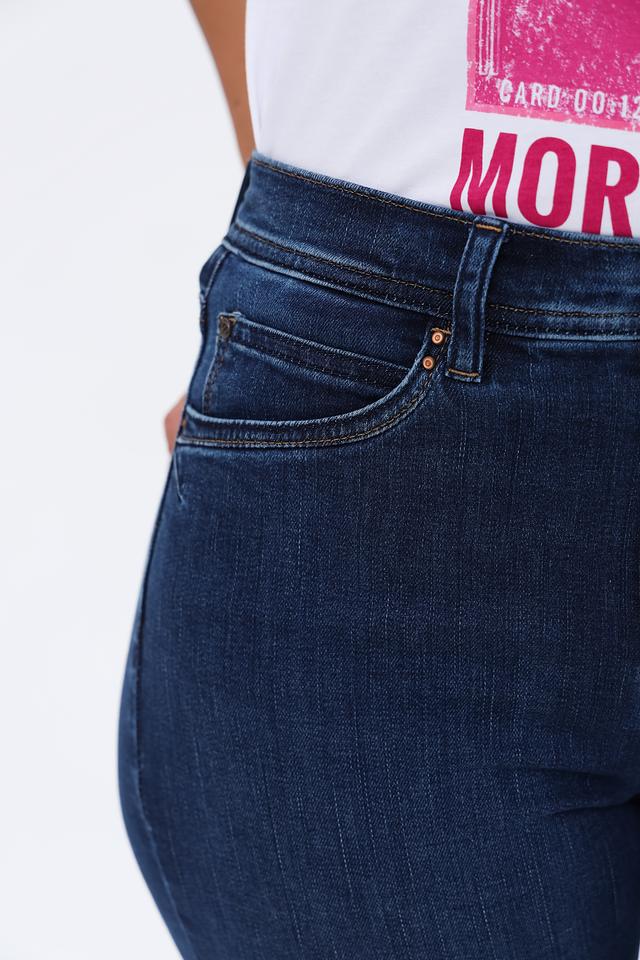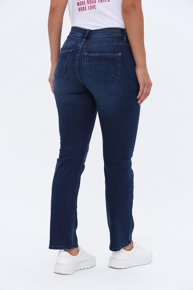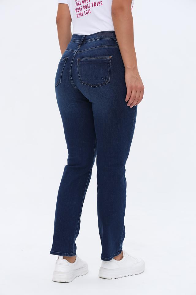 Джинсы имеют высокую посадку, подчеркивающую талию и создающую элегантный силуэт. Прямой крой обеспечивает комфортную посадку и свободу движений. Ткань состоит из хлопка (95%), полиэстера (3%) и эластана (2%), что обеспечивает мягкость, прочность и небольшую эластичность.