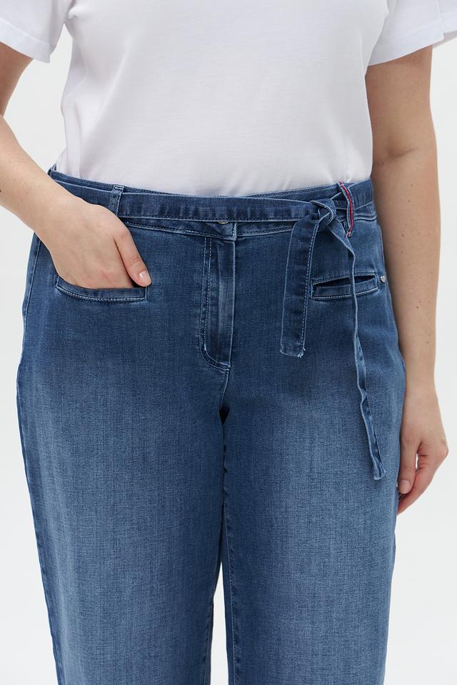 Особенностью этих джинсов является пояс с завязками, который позволяет подчеркнуть талию и создать более женственный силуэт. Джинсы изготовлены из высококачественного хлопка с добавлением эластана, что обеспечивает удобство в носке и сохранение формы.