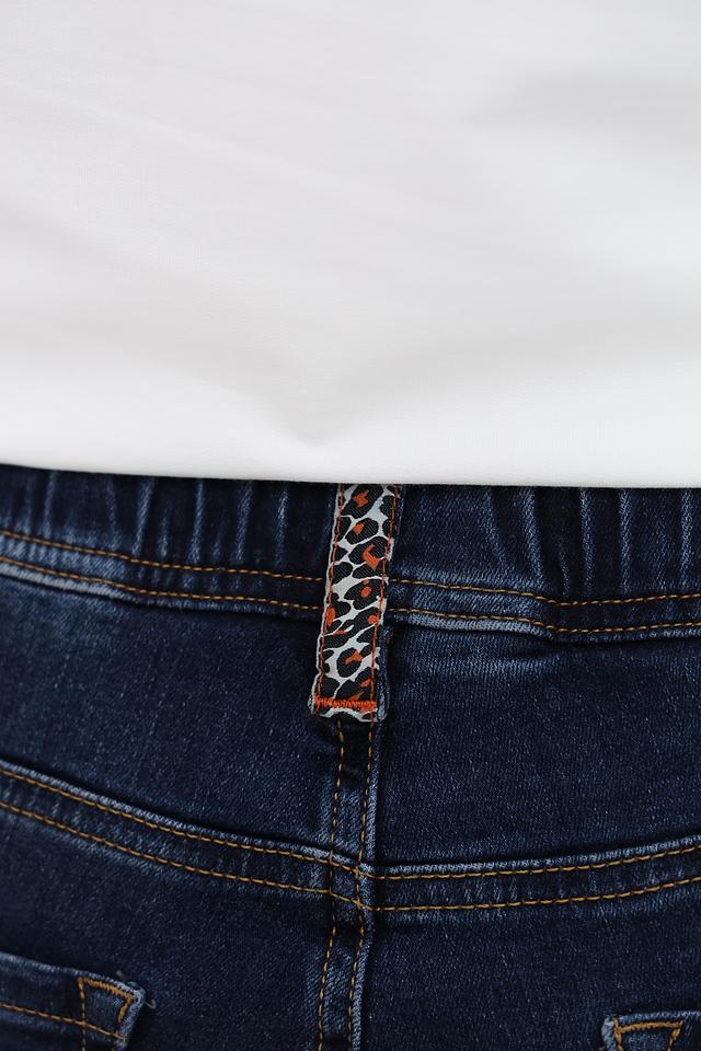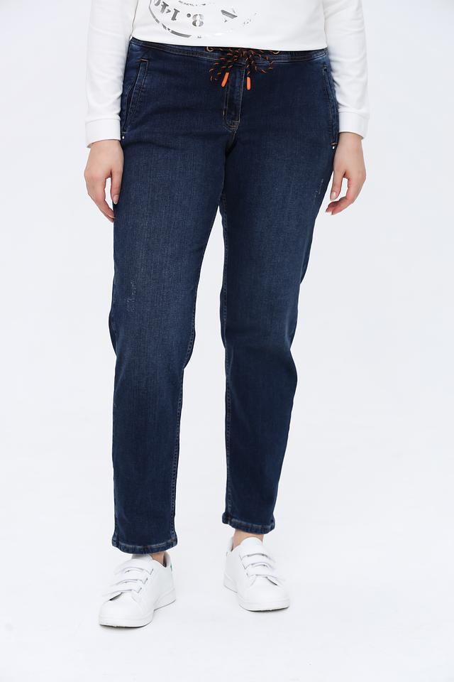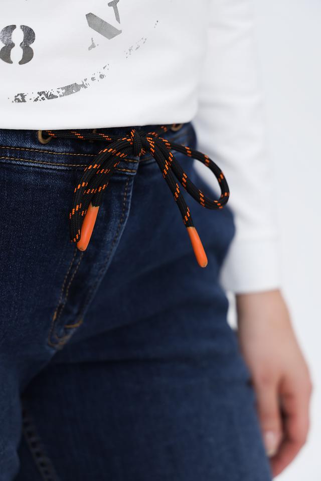 Джинсы выполнены из высококачественного хлопка (98%) с добавлением эластана (2%), что обеспечивает приятные тактильные ощущения, хорошую посадку по фигуре и свободу движений. Эластичный пояс дополнен яркими оранжево-черными утяжками, которые придают образу динамичный акцент.
