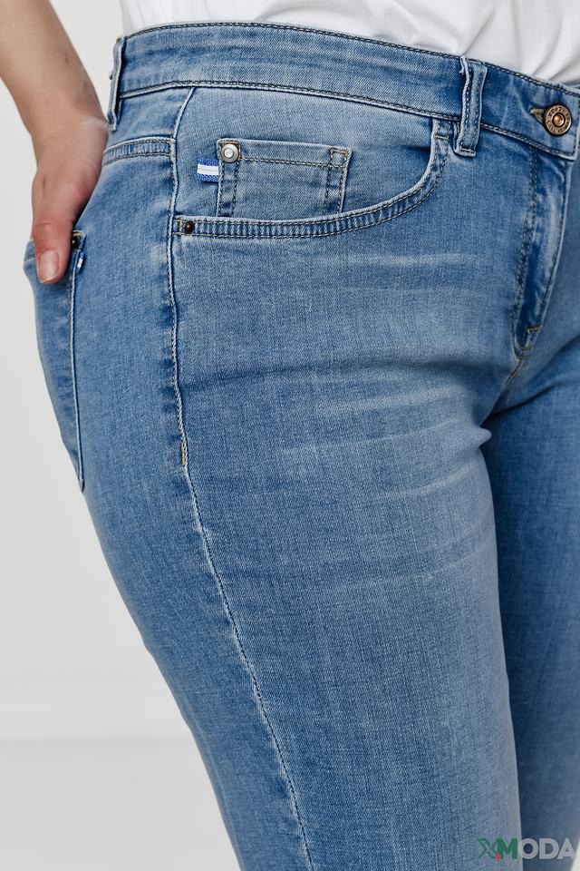 Джинсы имеют прямой крой и укороченную длину, что придает им современный и модный вид. Эффект потертостей добавляет образу непринужденности и индивидуальности. Застежка на молнию и пуговицу обеспечивает надежную фиксацию. Пять карманов – два спереди, два сзади и один небольшой карман для мелочи.
