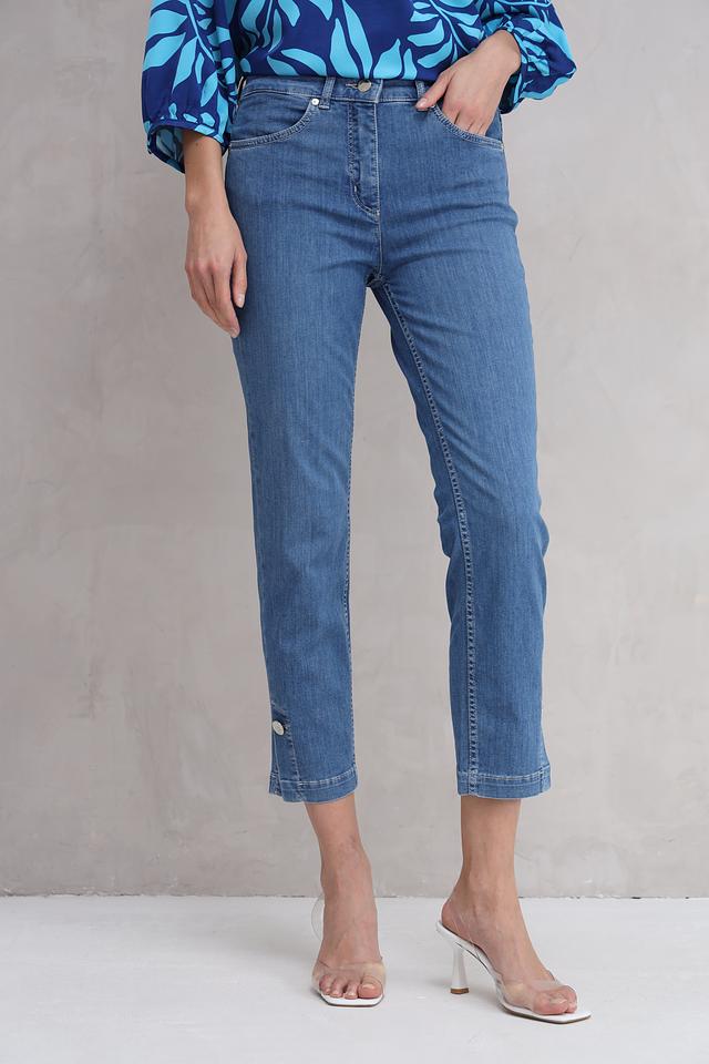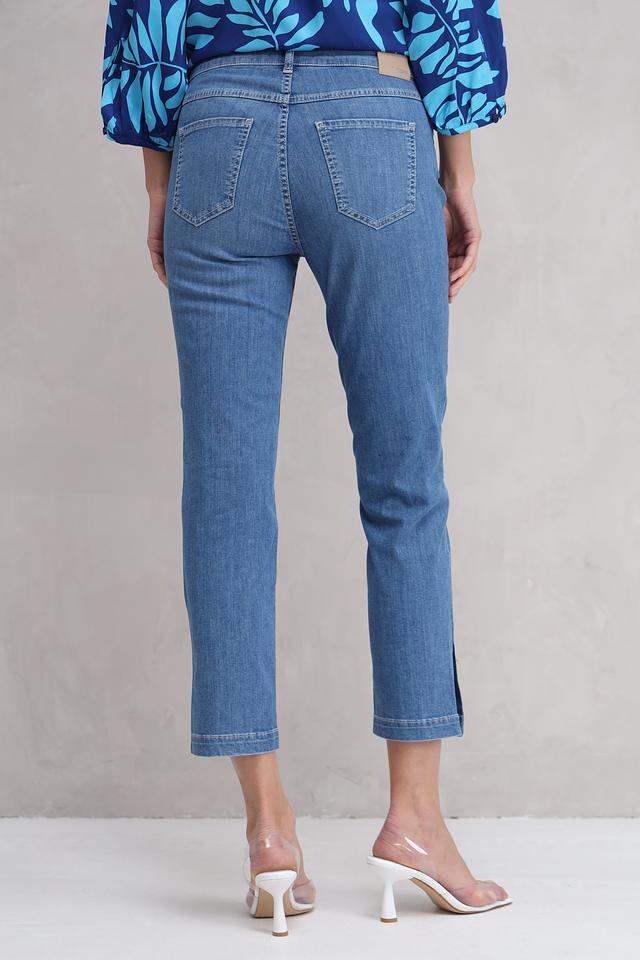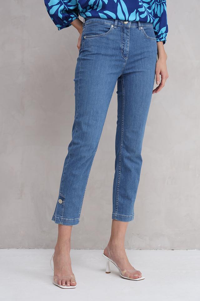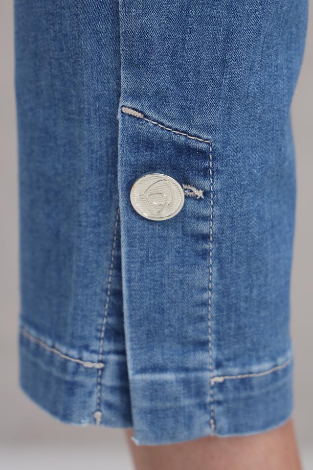 Джинсы имеют укороченный крой, что делает их идеальным выбором для теплого времени года или для создания модных образов. Застежка на пуговицу обеспечивает надежную фиксацию и комфорт при носке. Пять карманов — два спереди и два сзади — добавляют функциональности.
