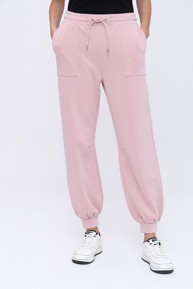 Брюки имеют удобный крой с эластичным поясом и манжетами на щиколотках, обеспечивающими плотную, но не стесняющую движений посадку. По бокам расположены функциональные карманы. На левой штанине имеется декоративная вышивка с логотипом бренда.