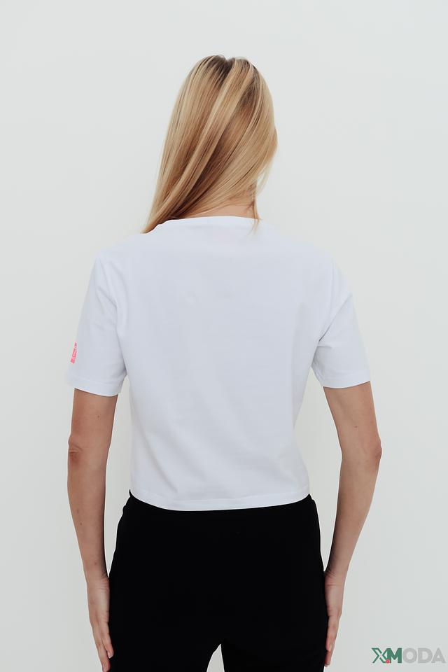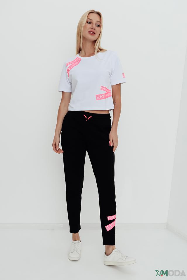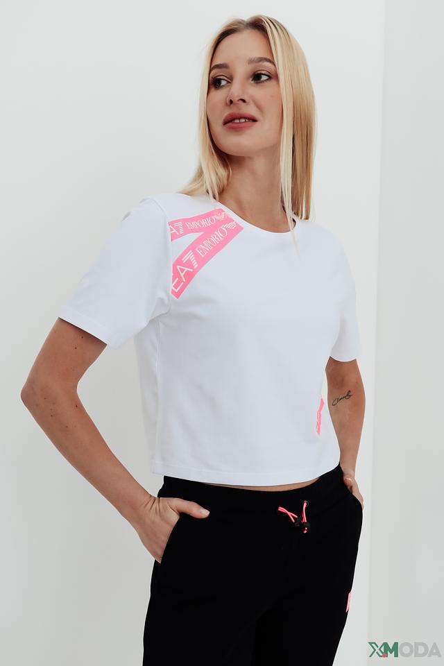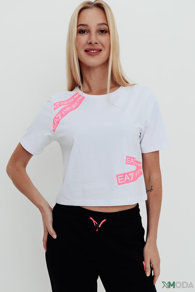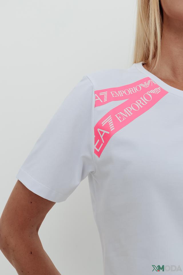 Белая женская футболка EA7 с коротким рукавом, украшенная яркими розовыми логотипами бренда. Модель выполнена из мягкого хлопка с добавлением эластана для комфорта и свободы движений. Состав: хлопок 93%, эластан 7%
