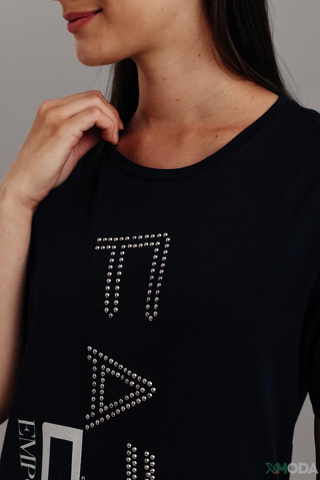 Дизайн футболки отличается лаконичностью и стилем. На передней части изделия размещены логотипы бренда Emporio Armani, выполненные в белом цвете и декорированные стразами, что придает футболке изысканный вид.