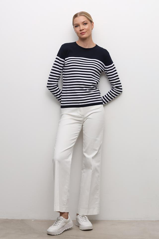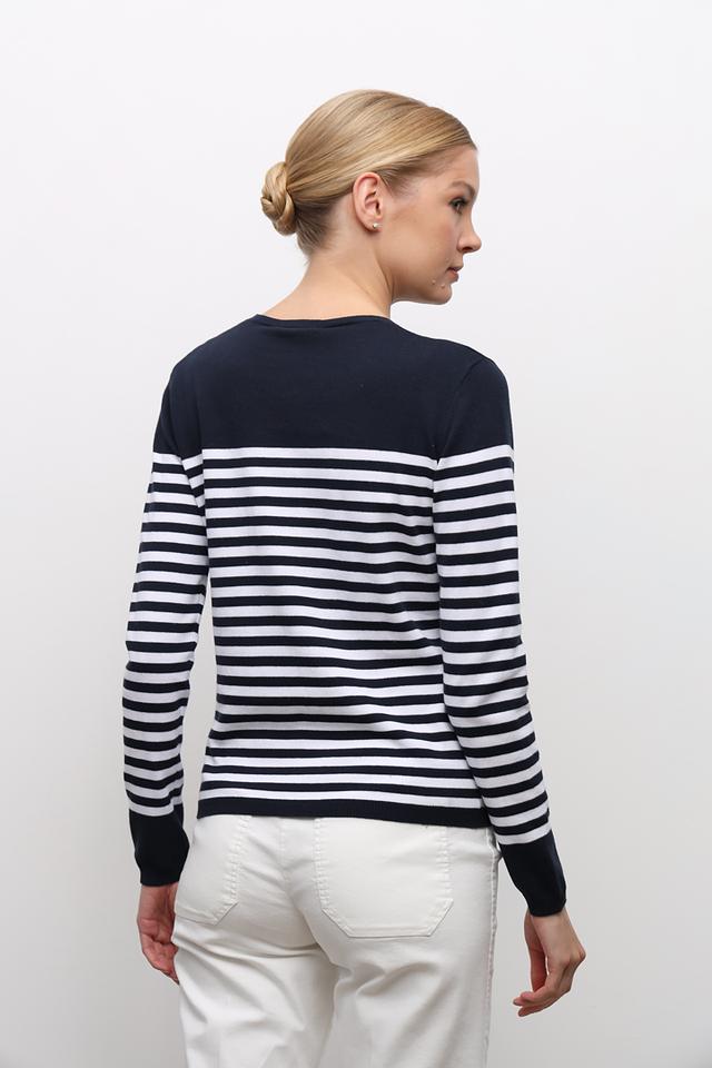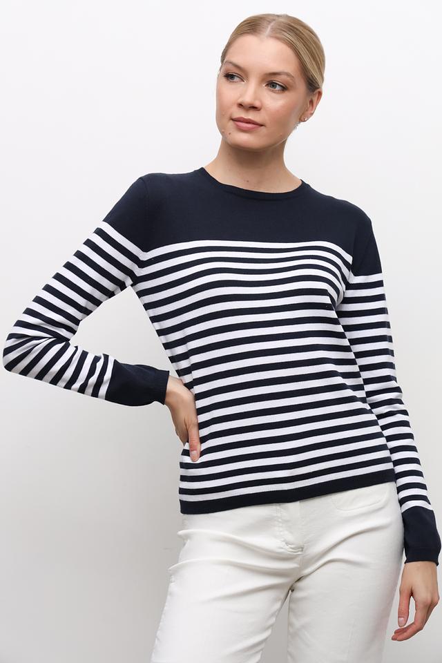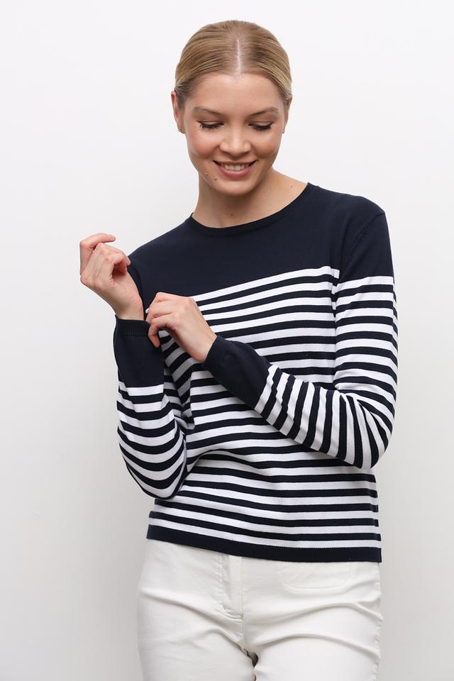Женский пуловер Electra style синего цвета с классическим полосатым узором. Изготовлен из мягкого хлопка, обеспечивающего комфорт в носке. Идеально подходит для создания повседневных образов. Состав: хлопок 100%