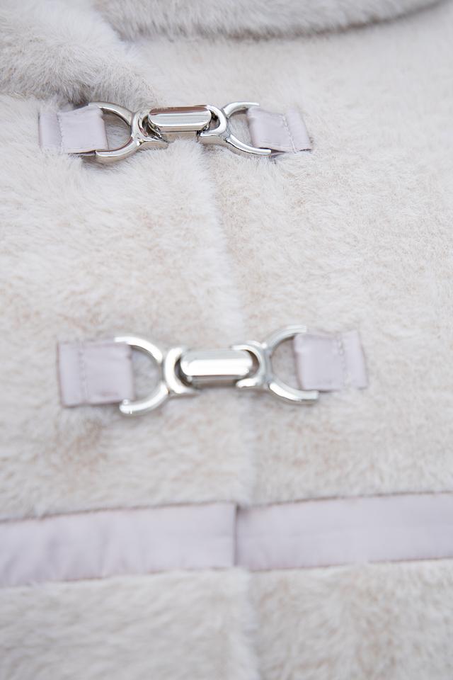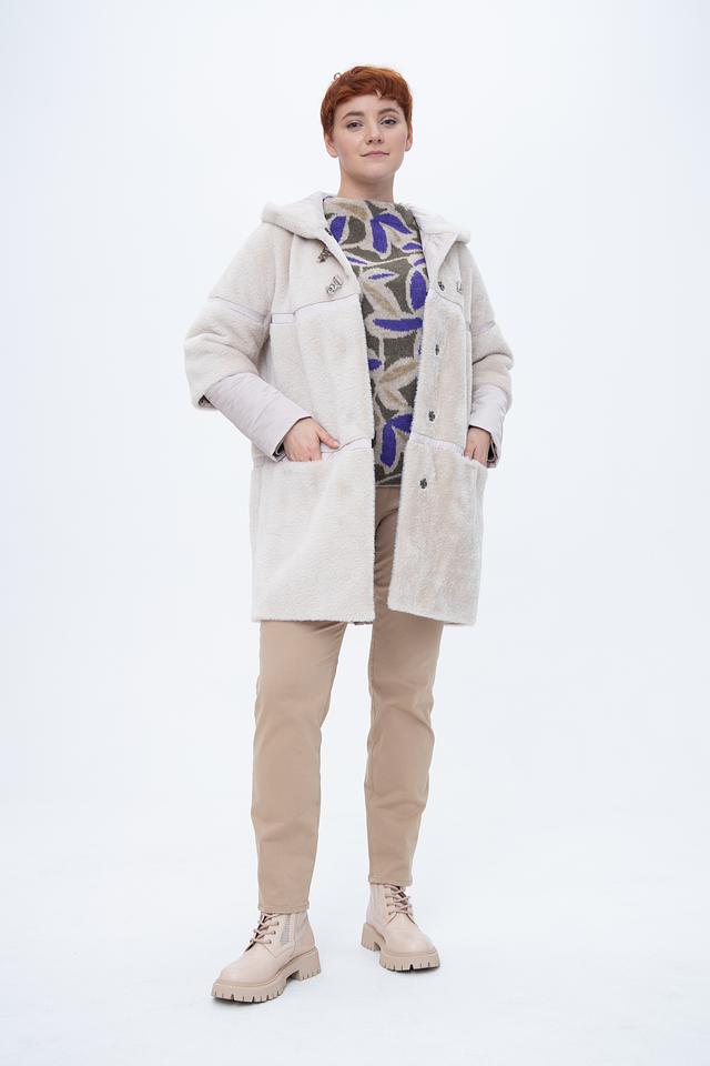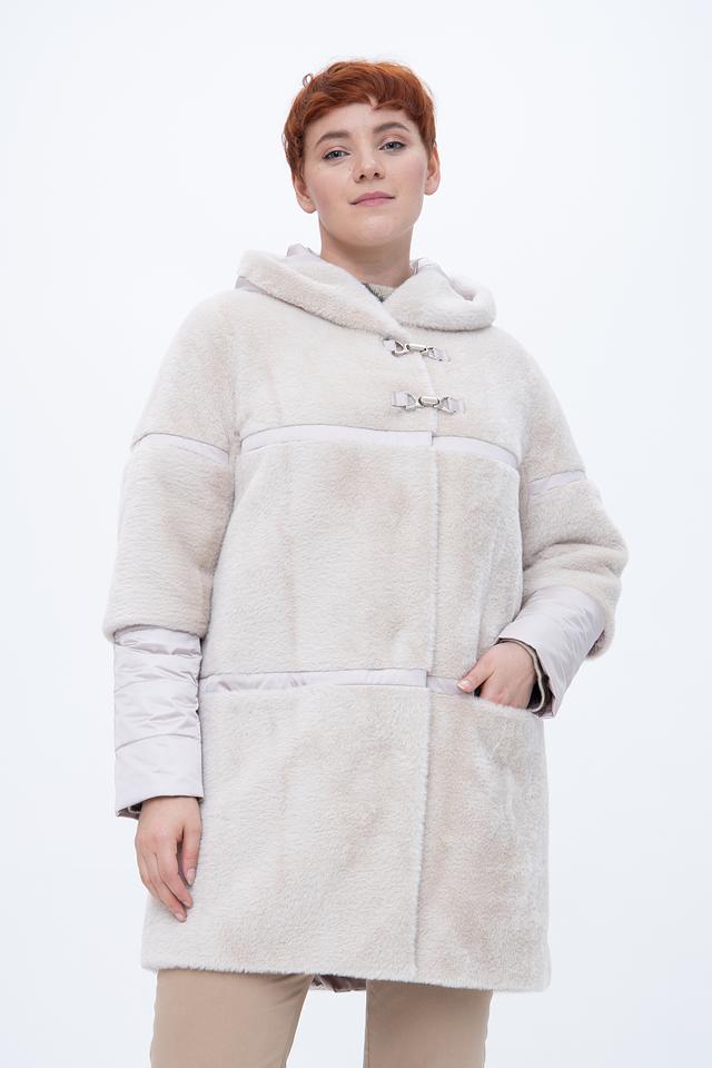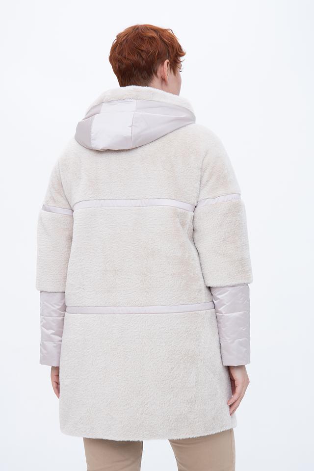 Куртка выполнена в бежевом цвете из мягкого искусственного меха, который создает ощущение тепла и комфорта. Отделка из стеганой ткани на рукавах и капюшоне добавляет оригинальности и стиля.
