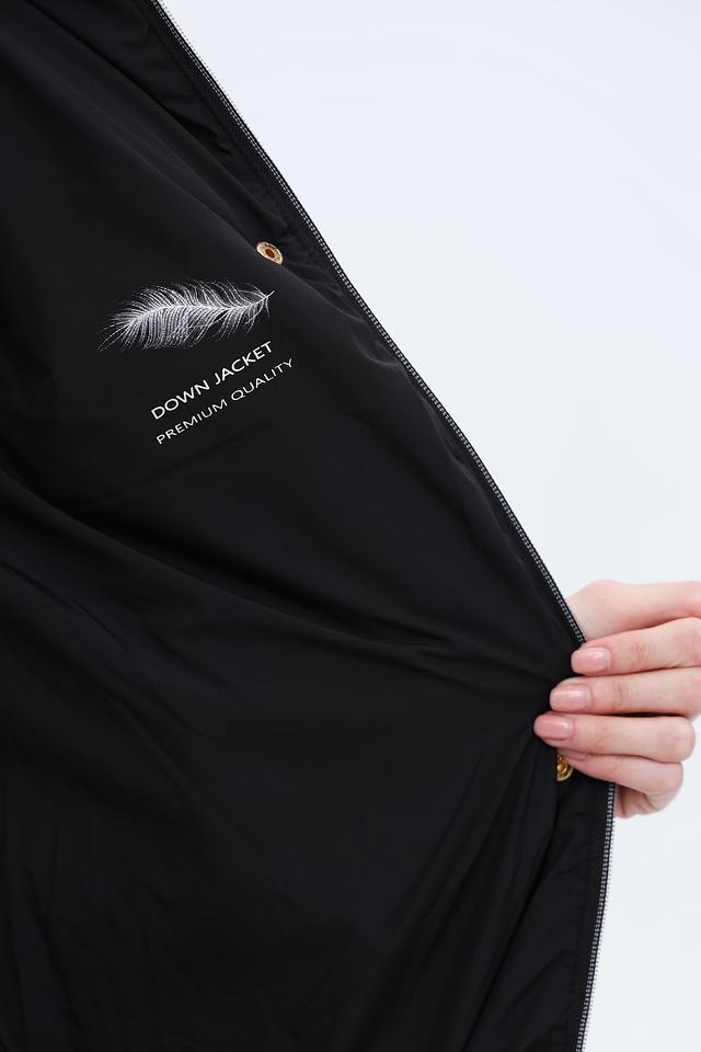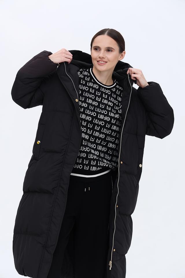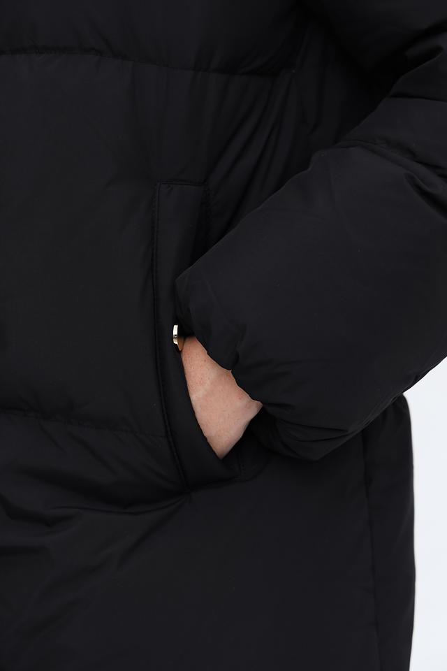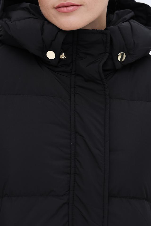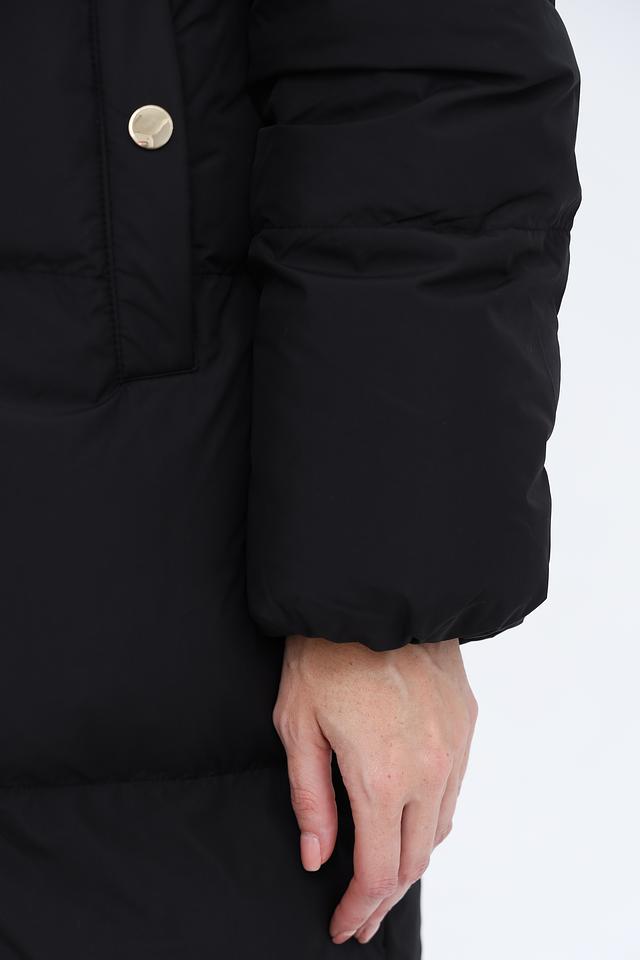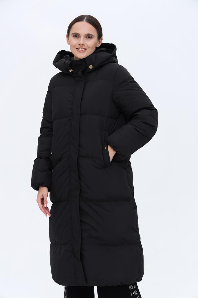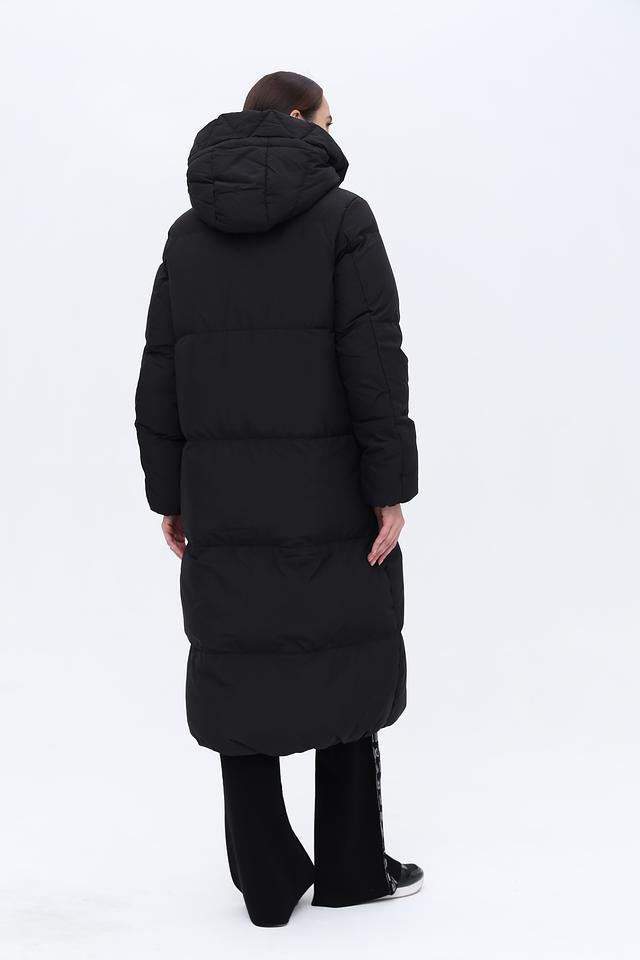 Пальто имеет удлинённый силуэт и стеганую фактуру, которая придает ему современный вид. Капюшон обеспечивает дополнительную защиту от ветра и снега. Застежка-молния позволяет легко регулировать степень теплоизоляции.