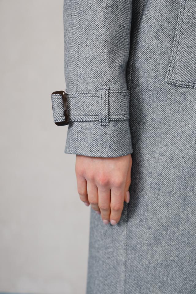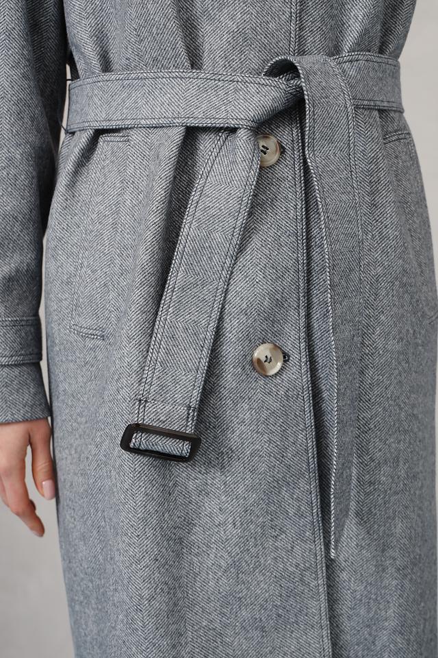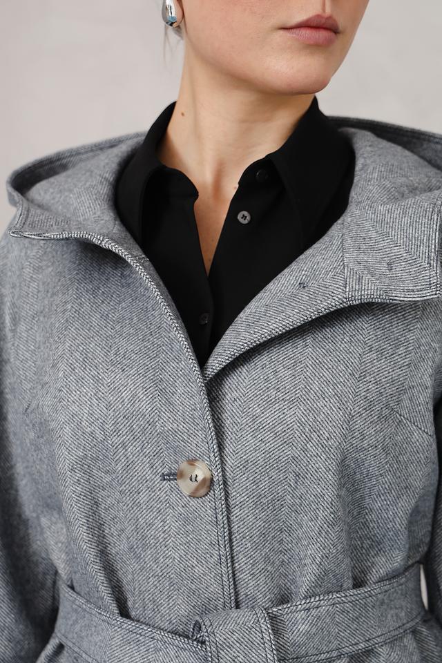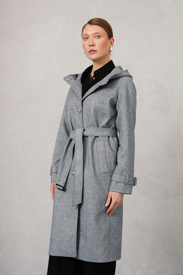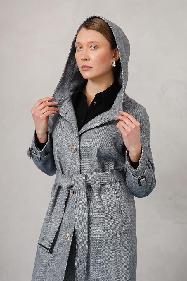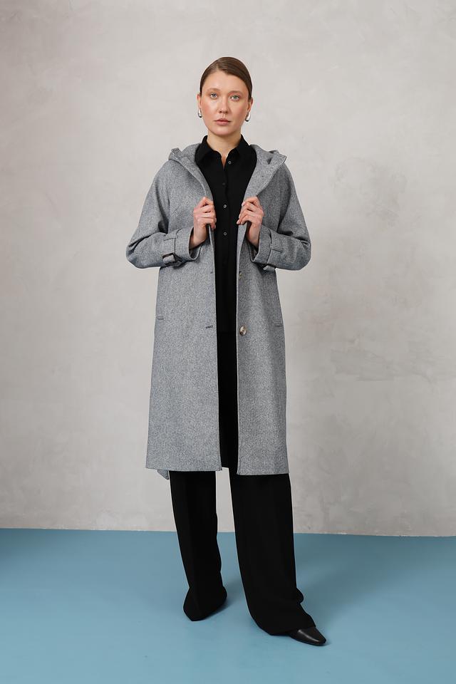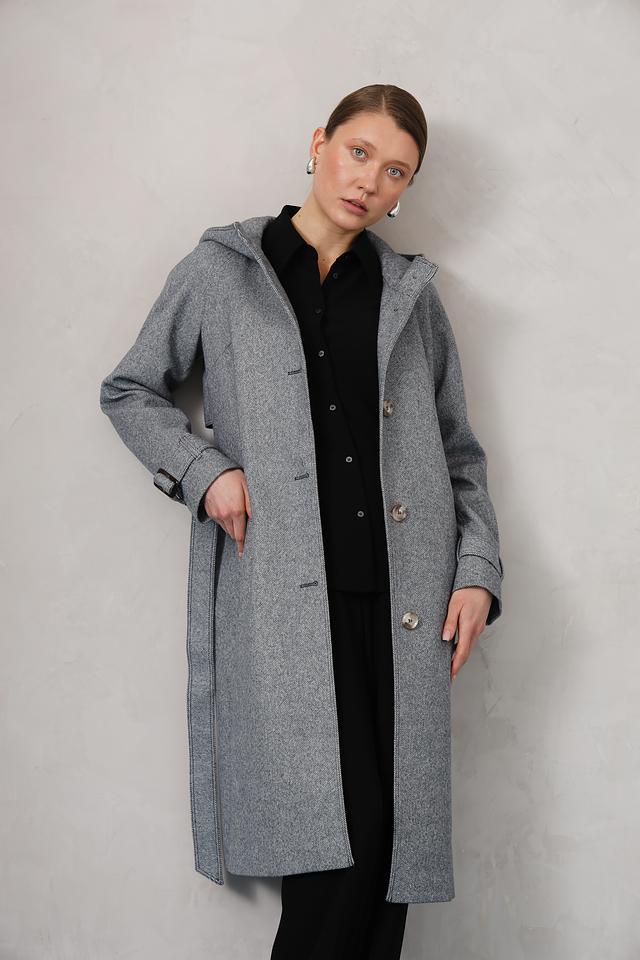 Модель имеет прямой крой, капюшон и пояс, что позволяет создавать различные образы – от повседневных до более формальных. Застежка на пуговицы обеспечивает надежную фиксацию, а рукава с аккуратными манжетами добавляют пальто завершенный вид.