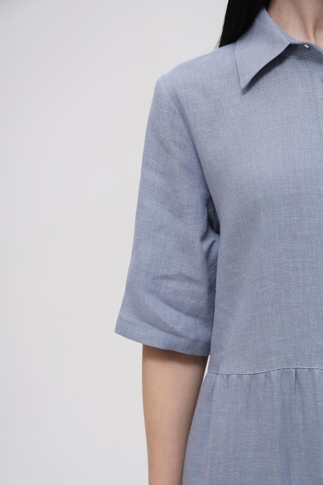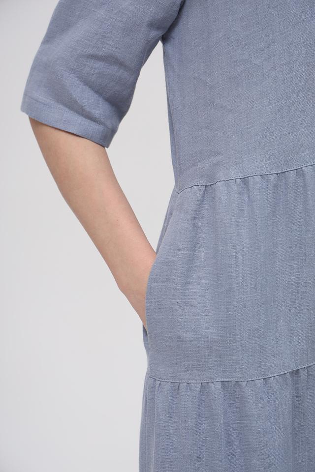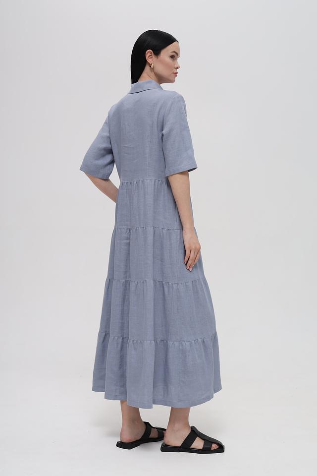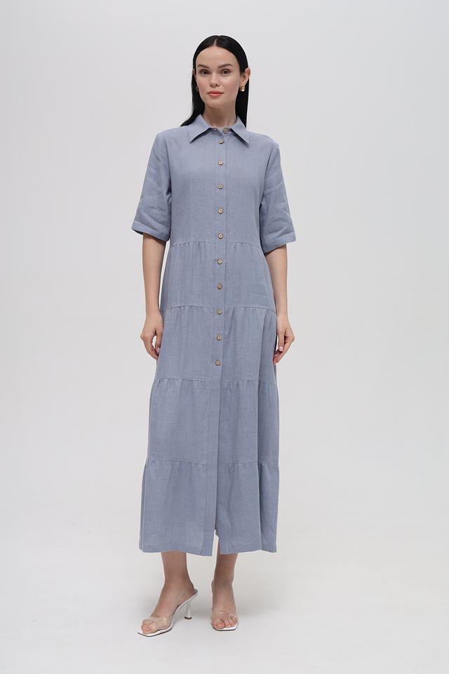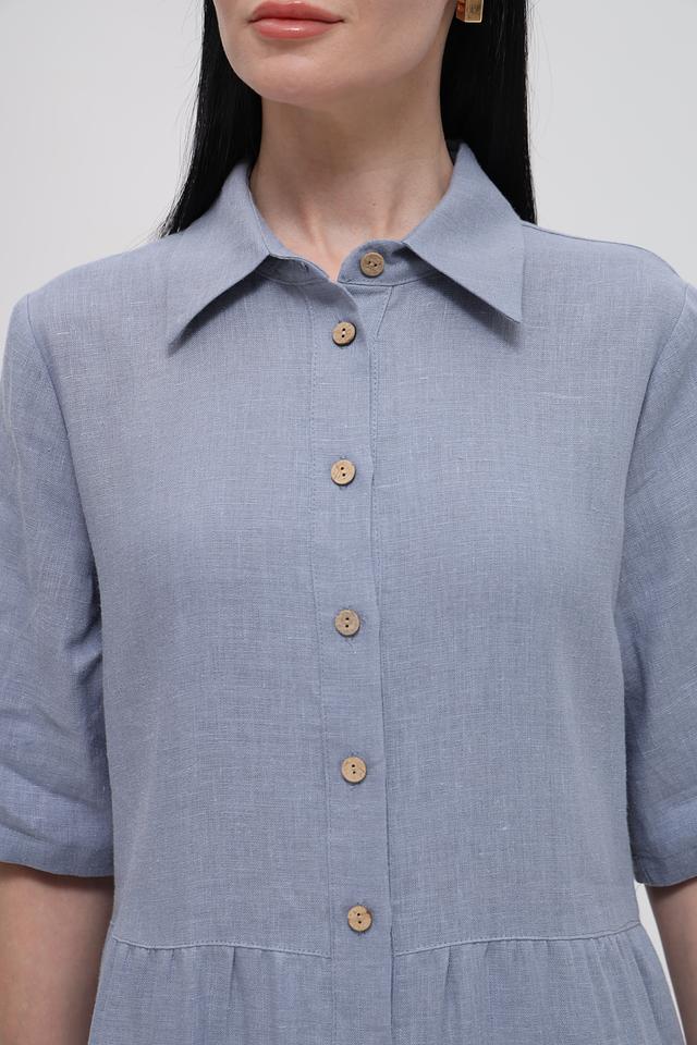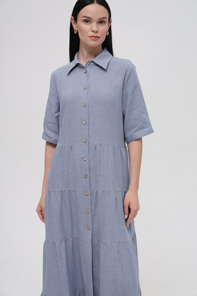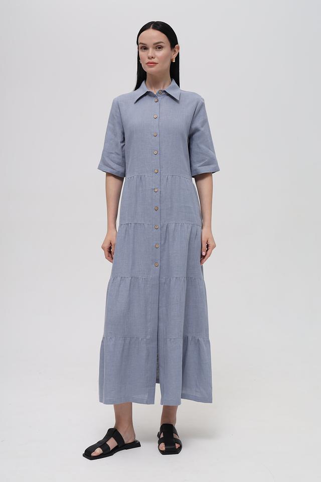 Голубое льняное платье от Electra style – это идеальный выбор для создания лёгкого и стильного образа. Платье выполнено из натурального льна, имеет рубашечный крой, застёжку на пуговицы и многоярусную юбку. Состав: лен 100%