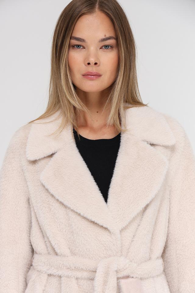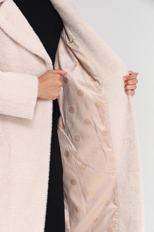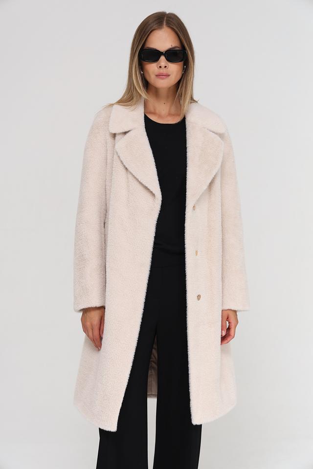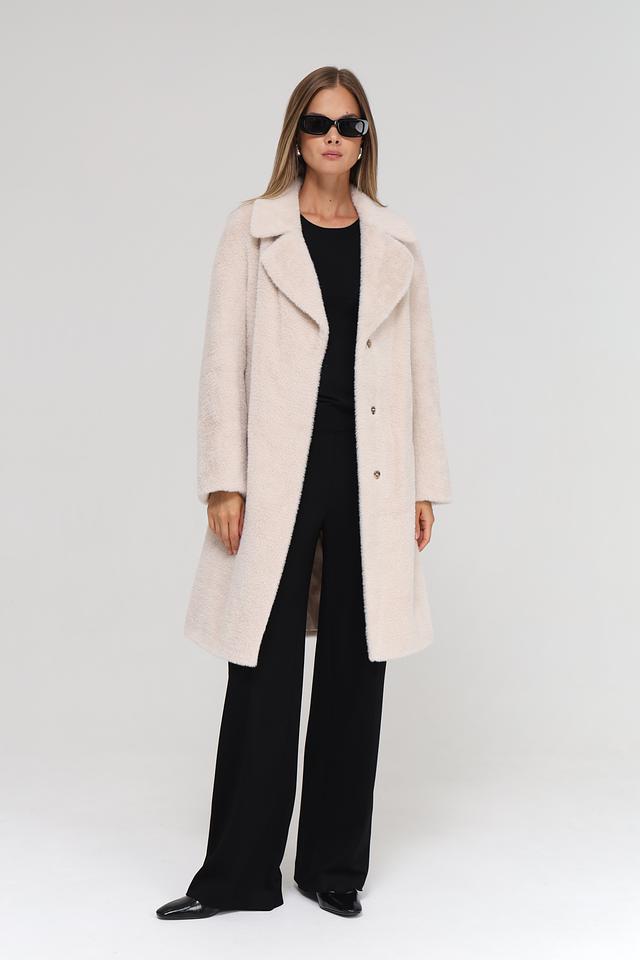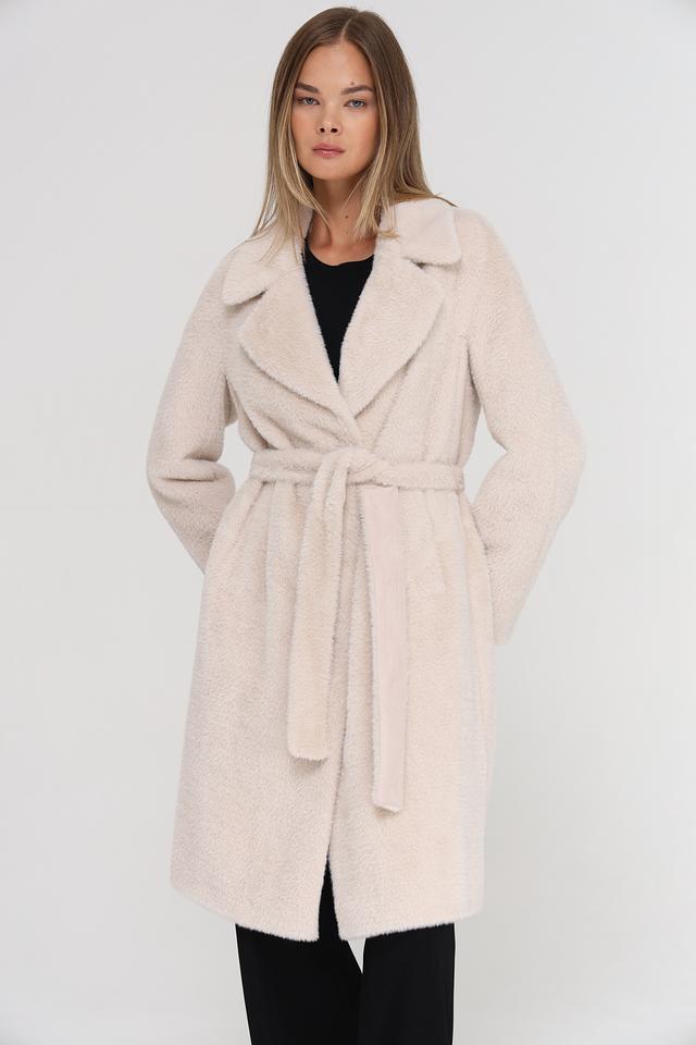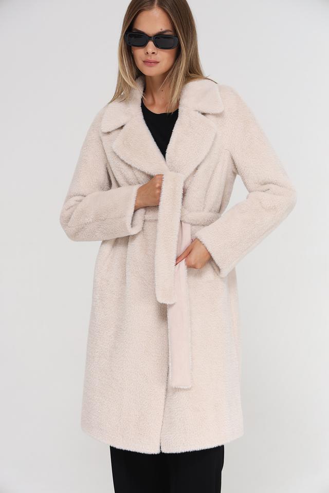 Модель имеет прямой крой, отложной воротник и застегивается на пуговицы. Пальто дополнено поясом, который позволяет подчеркнуть талию и создать более женственный силуэт. Текстура ткани напоминает мягкую шерсть, что придает пальто особый шарм.