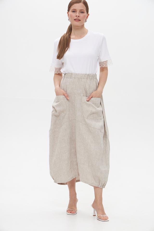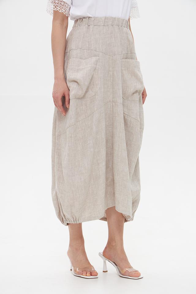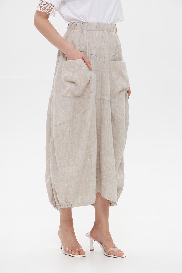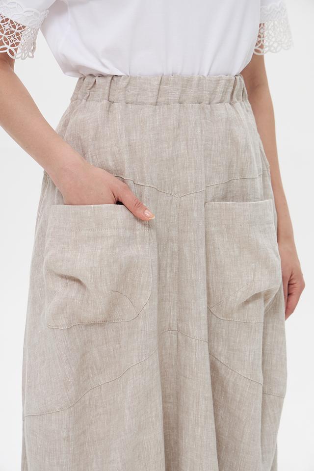 Юбка выполнена из 100% льна, приятного на ощупь и хорошо пропускающего воздух. Она имеет свободный крой и эластичный пояс на резинке, что обеспечивает удобную посадку по фигуре. Модель дополнена двумя вместительными боковыми карманами.