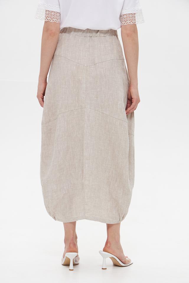 Дизайн юбки выполнен в минималистичном стиле, с акцентом на фактуру льна и аккуратные швы с отделкой. Она идеально сочетается с простыми топами, футболками и сандалиями, создавая непринужденный и стильный образ. Длина юбки миди, что делает её универсальной для различных случаев.