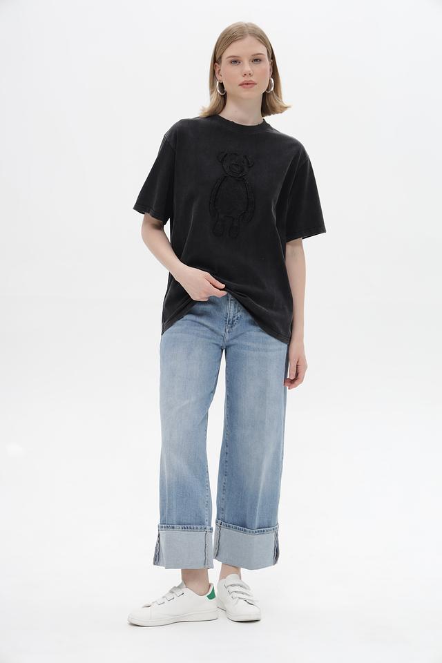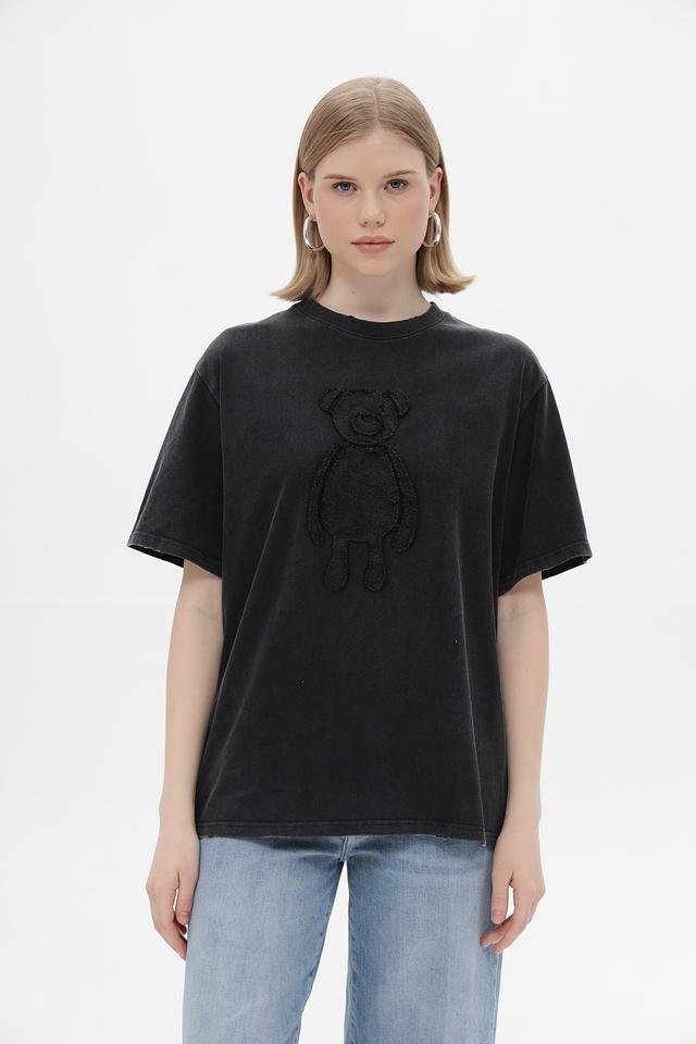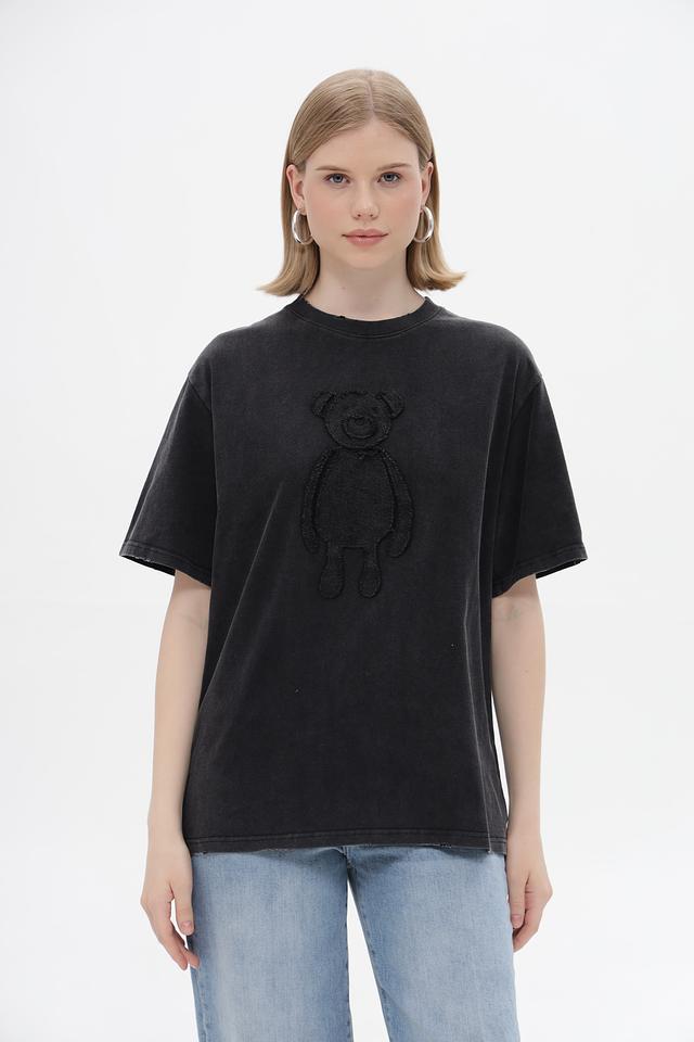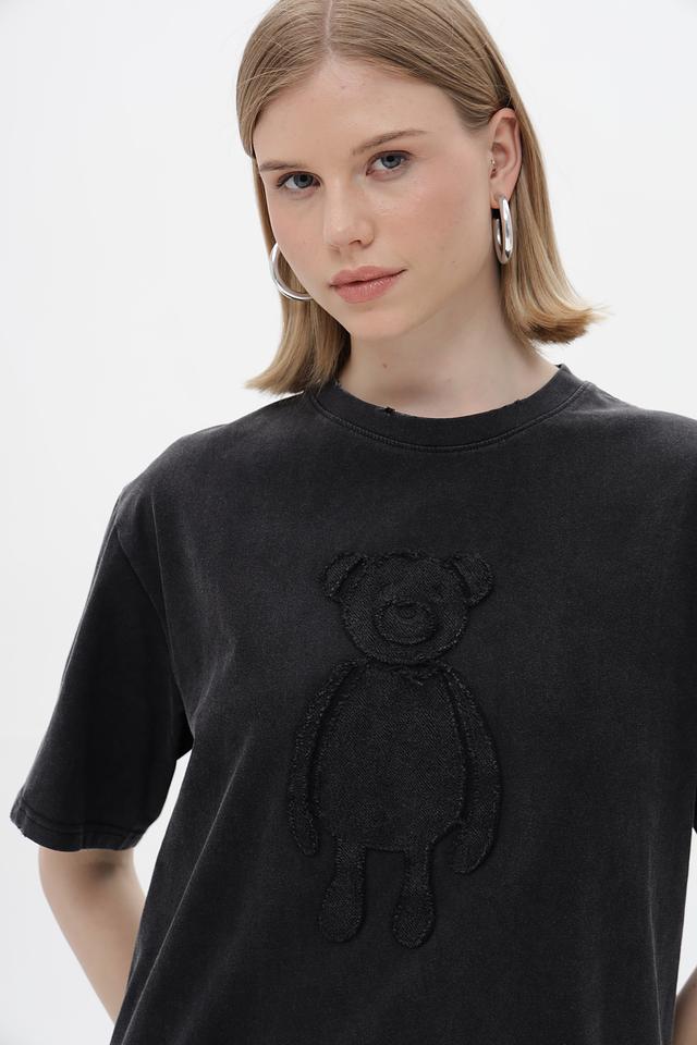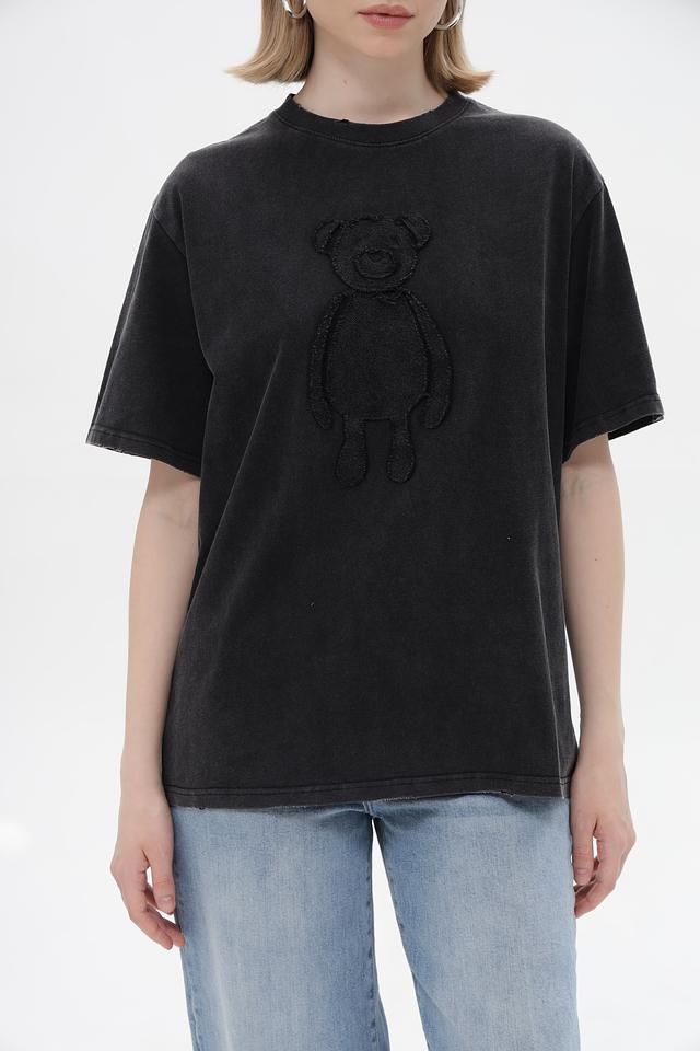Футболка имеет свободный крой, который не сковывает движений и позволяет создать расслабленный образ. Особенностью данной модели является стильный принт с изображением медвежонка, выполненный в тон ткани, что придает ей оригинальность.